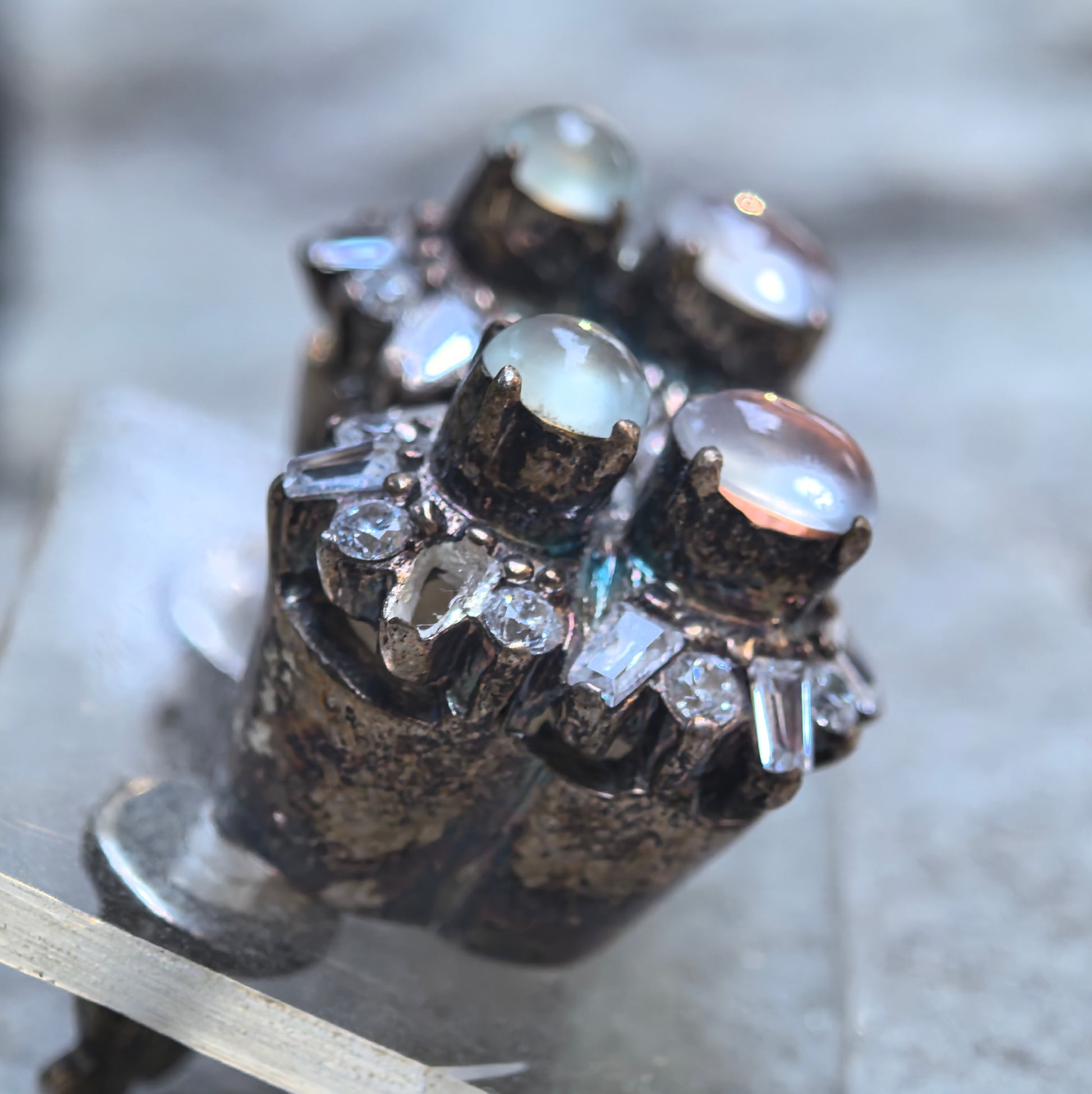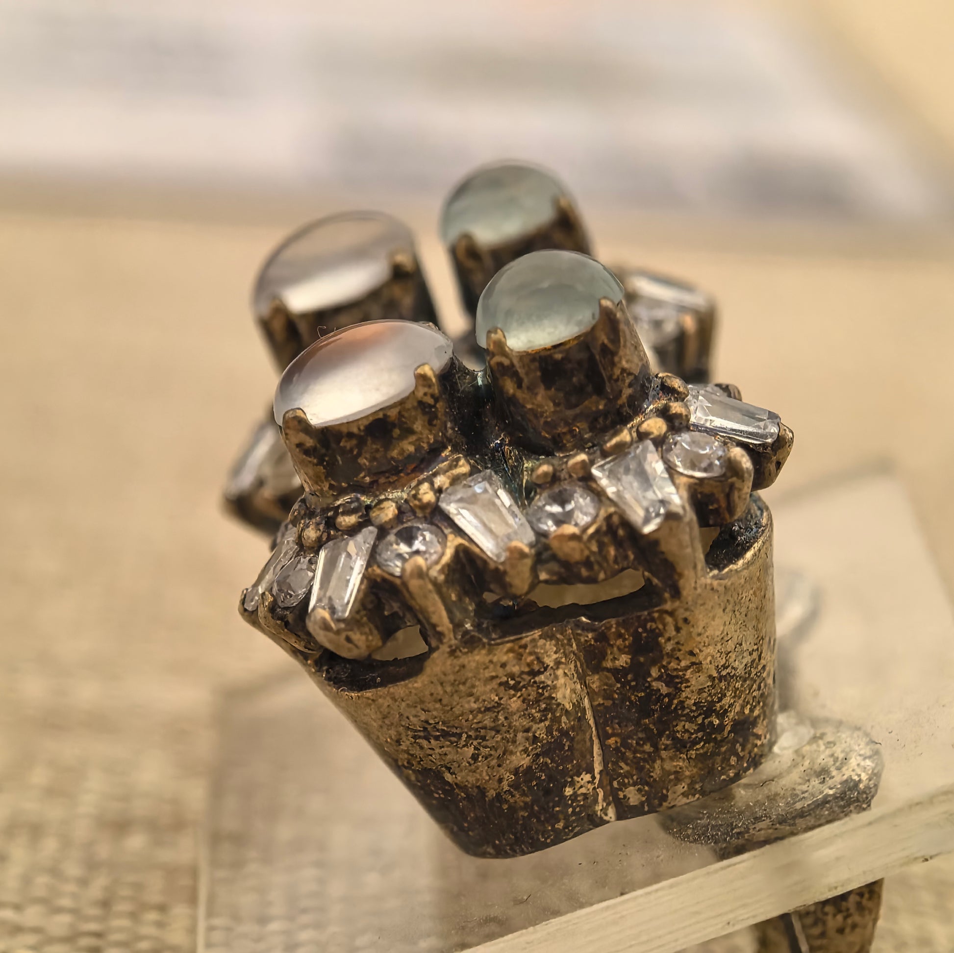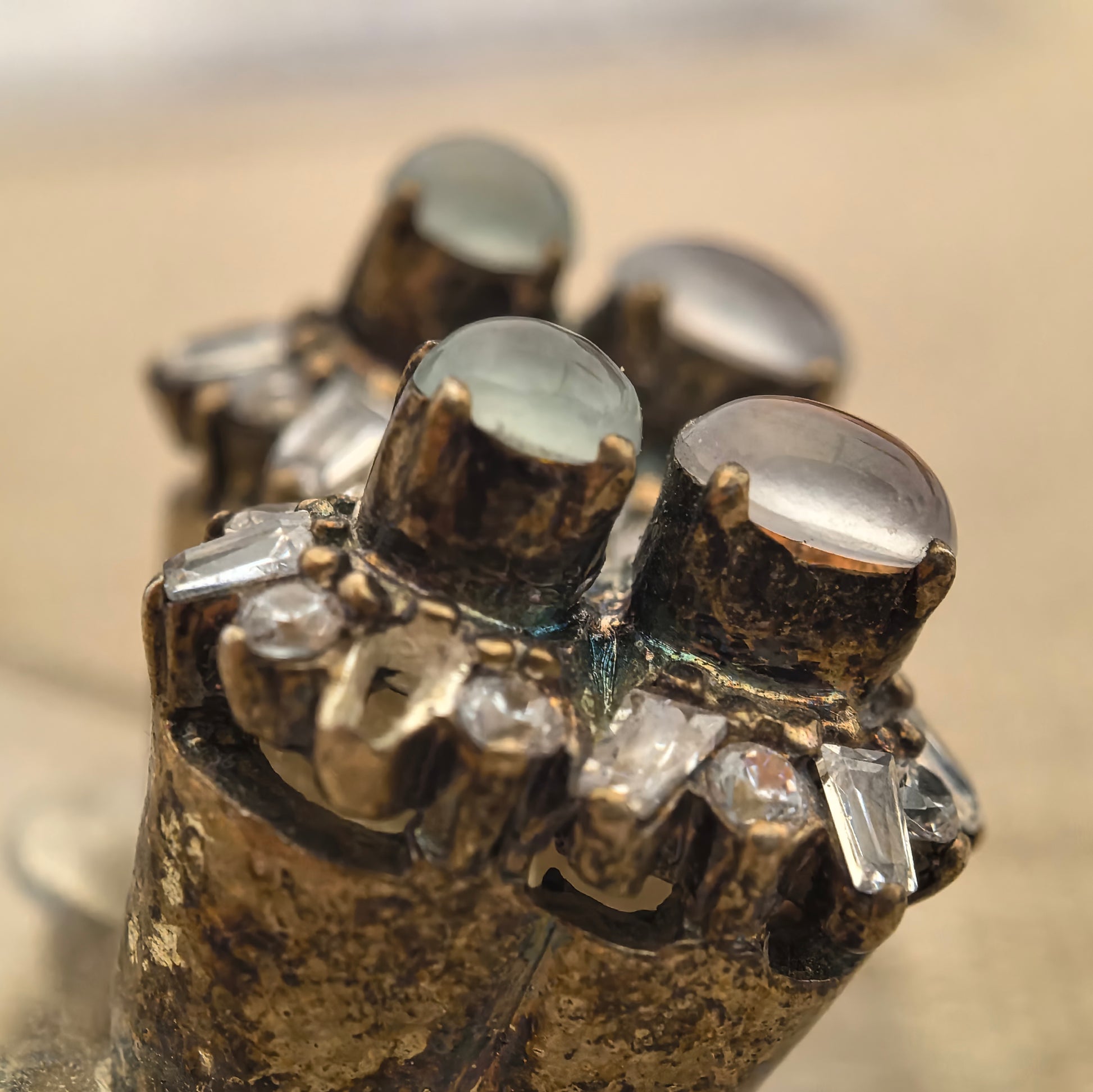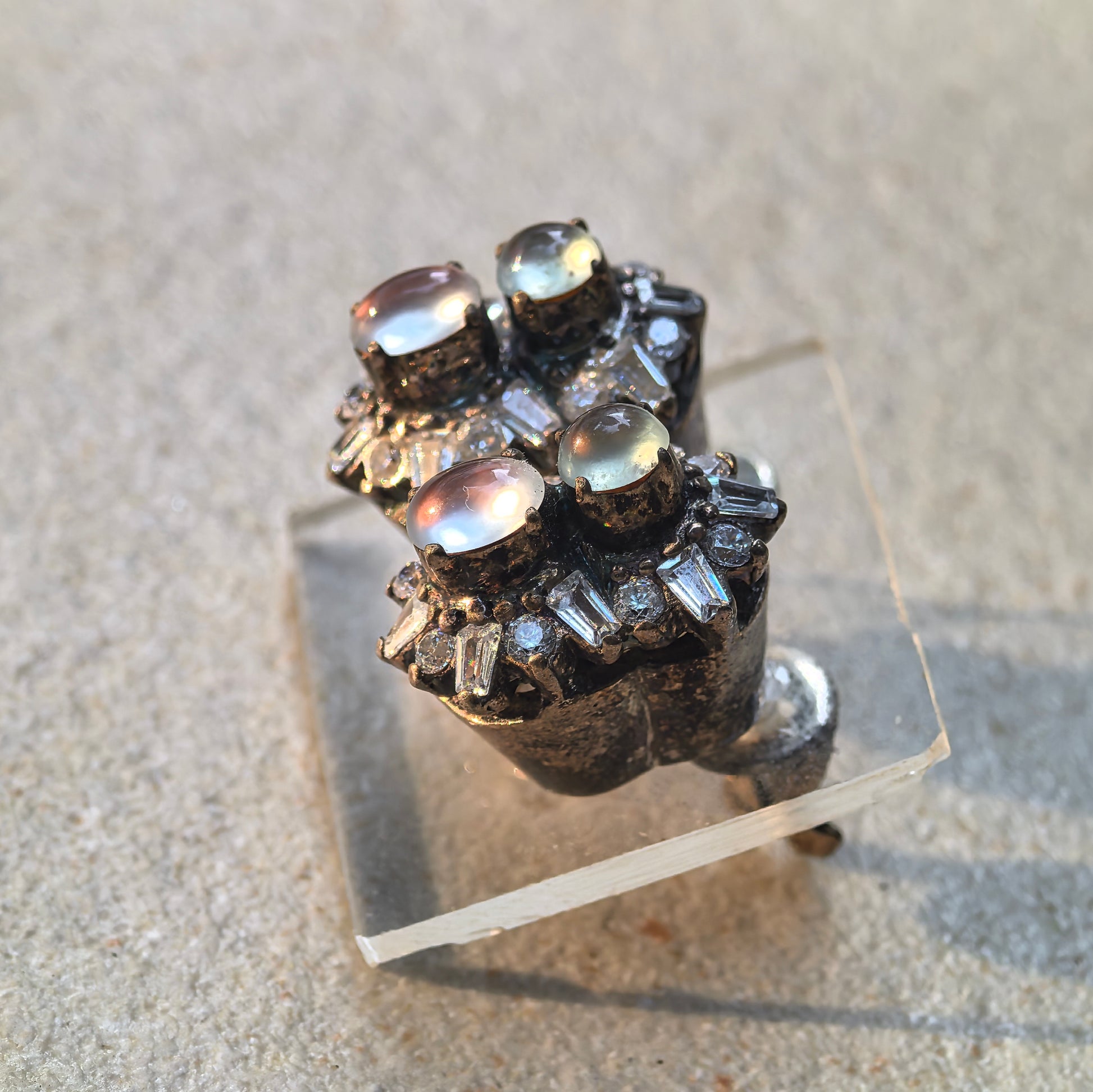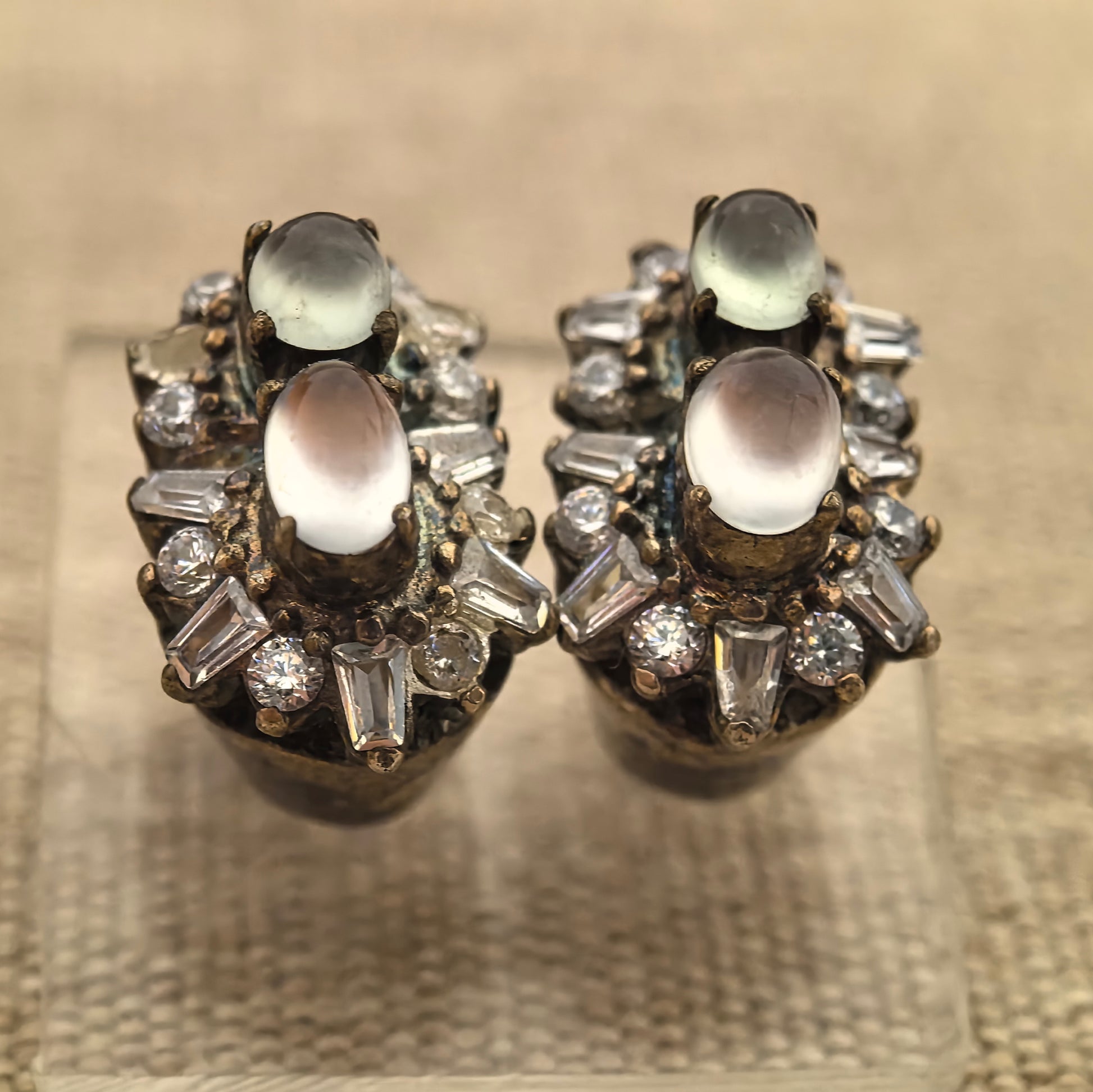 The jadeite pieces are currently mounted in a copper setting, which is mainly for display and photography. The copper mount lets you clearly see how the stones sit on the ear, but it is not intended to be worn.