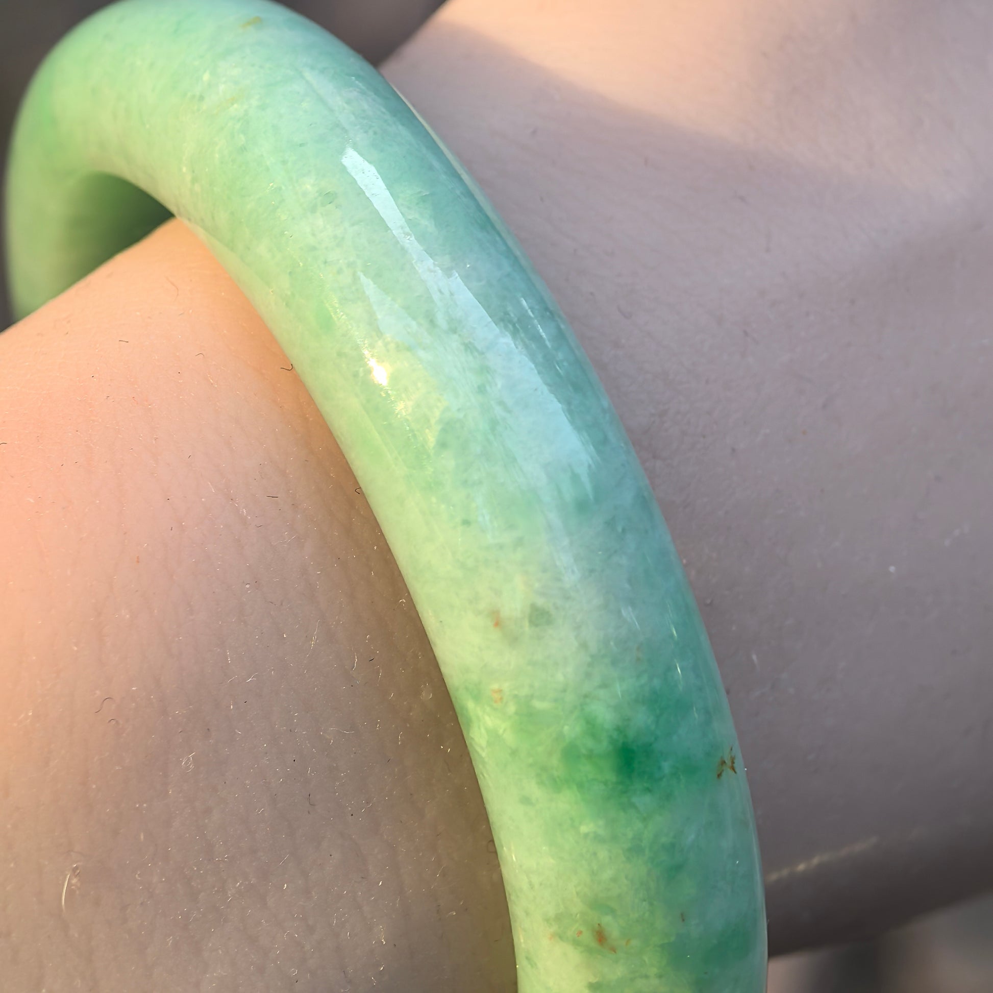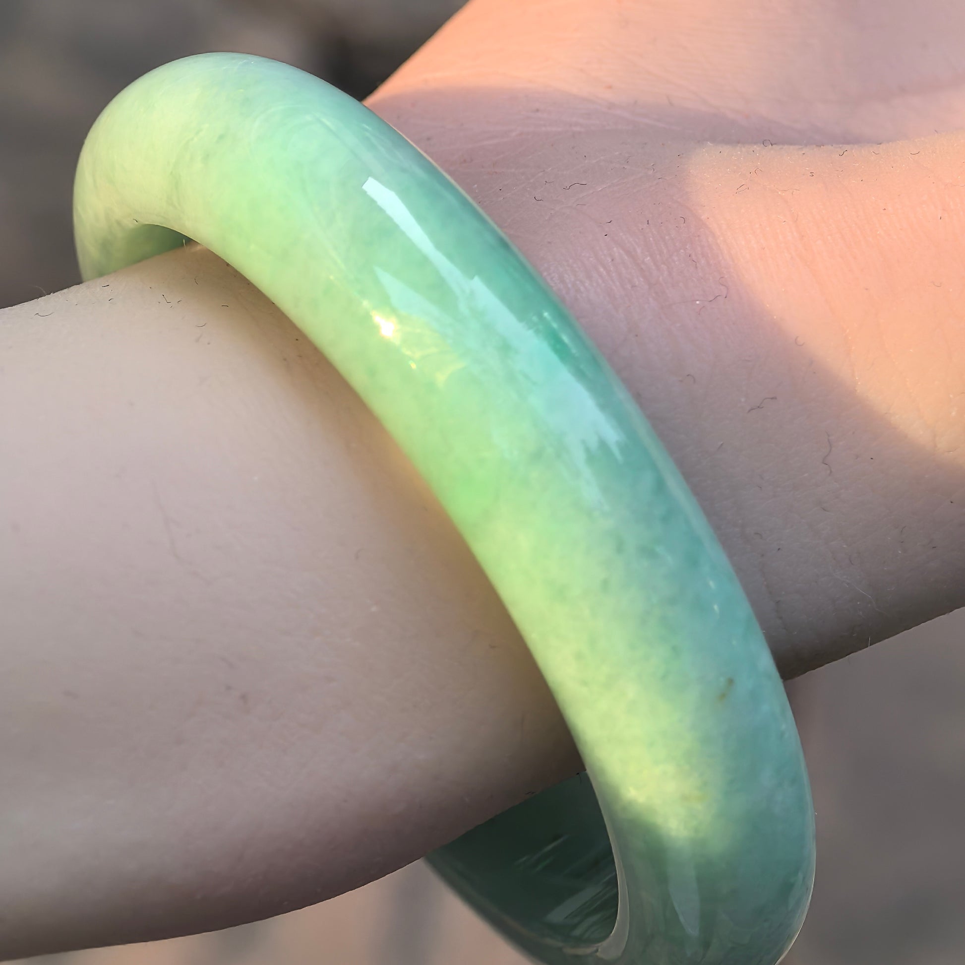 This natural Burmese jadeite D-shape bangle features a fresh apple green tone with warm yellow “gold splash” patches that look especially lively in sunlight. The texture is glutinous, giving the piece a gentle glow rather than a glassy look.