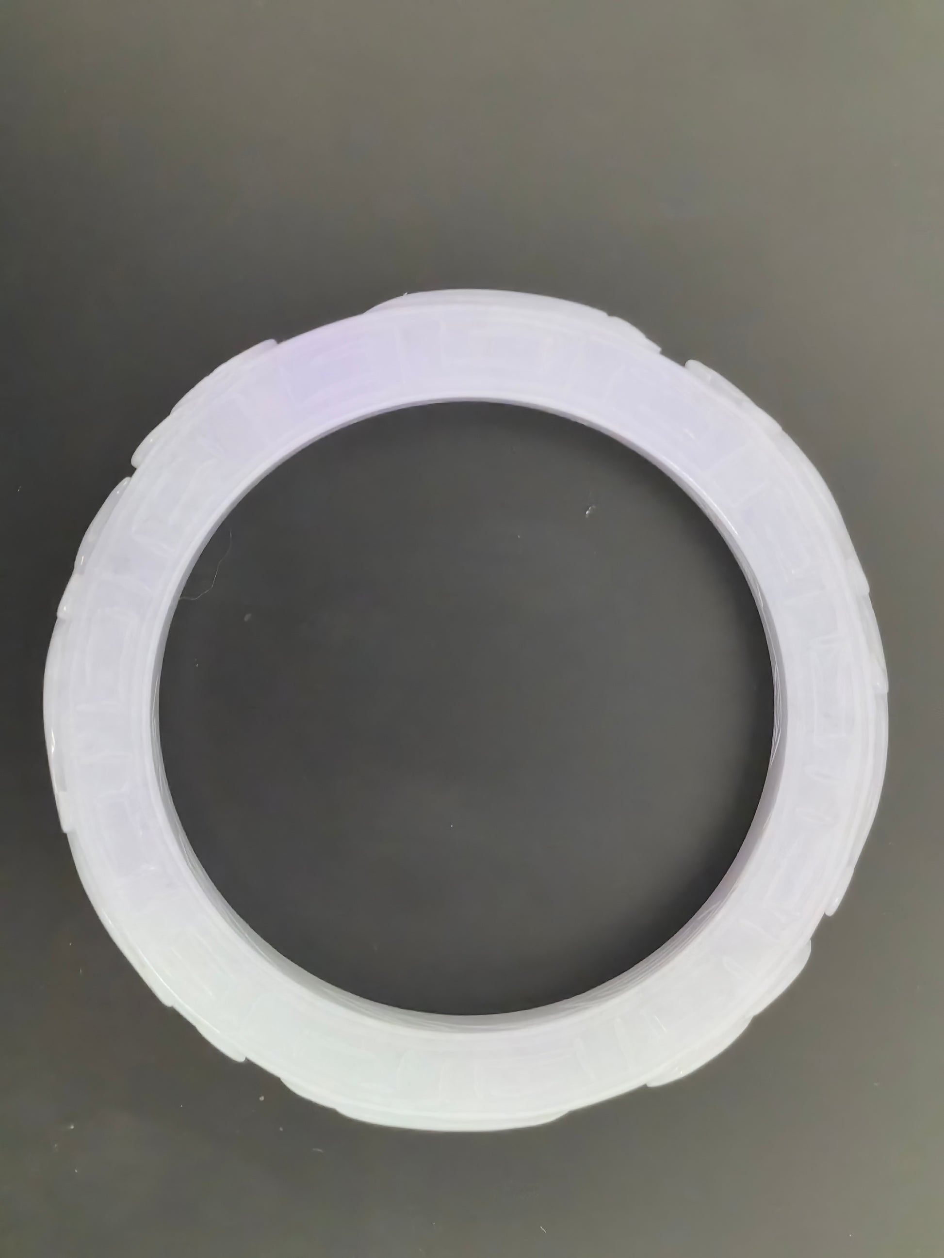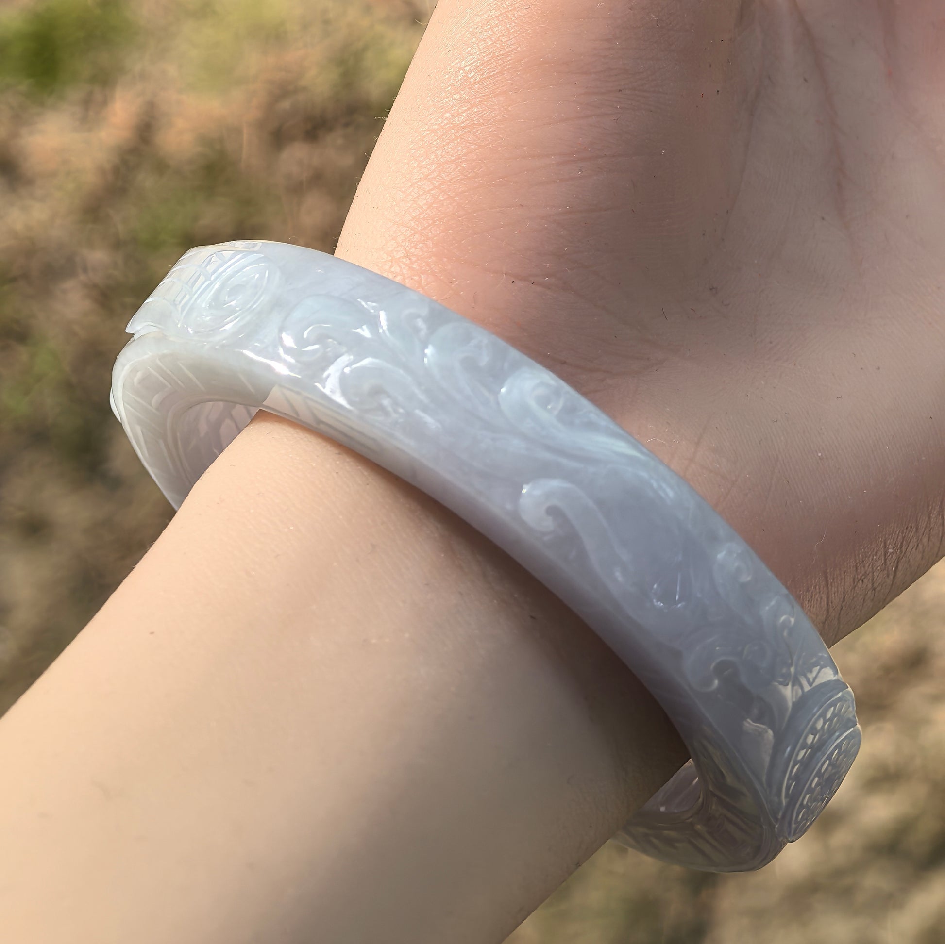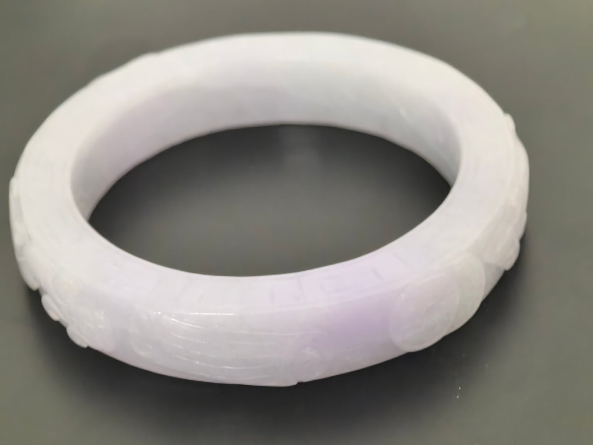 This large carved jadeite bangle has a soft pale tone that reads mostly white with a very light lavender undertone when seen under natural light. The outer band is fully carved with bold motifs and repeating patterns, giving it a strong, classical presence on the wrist.