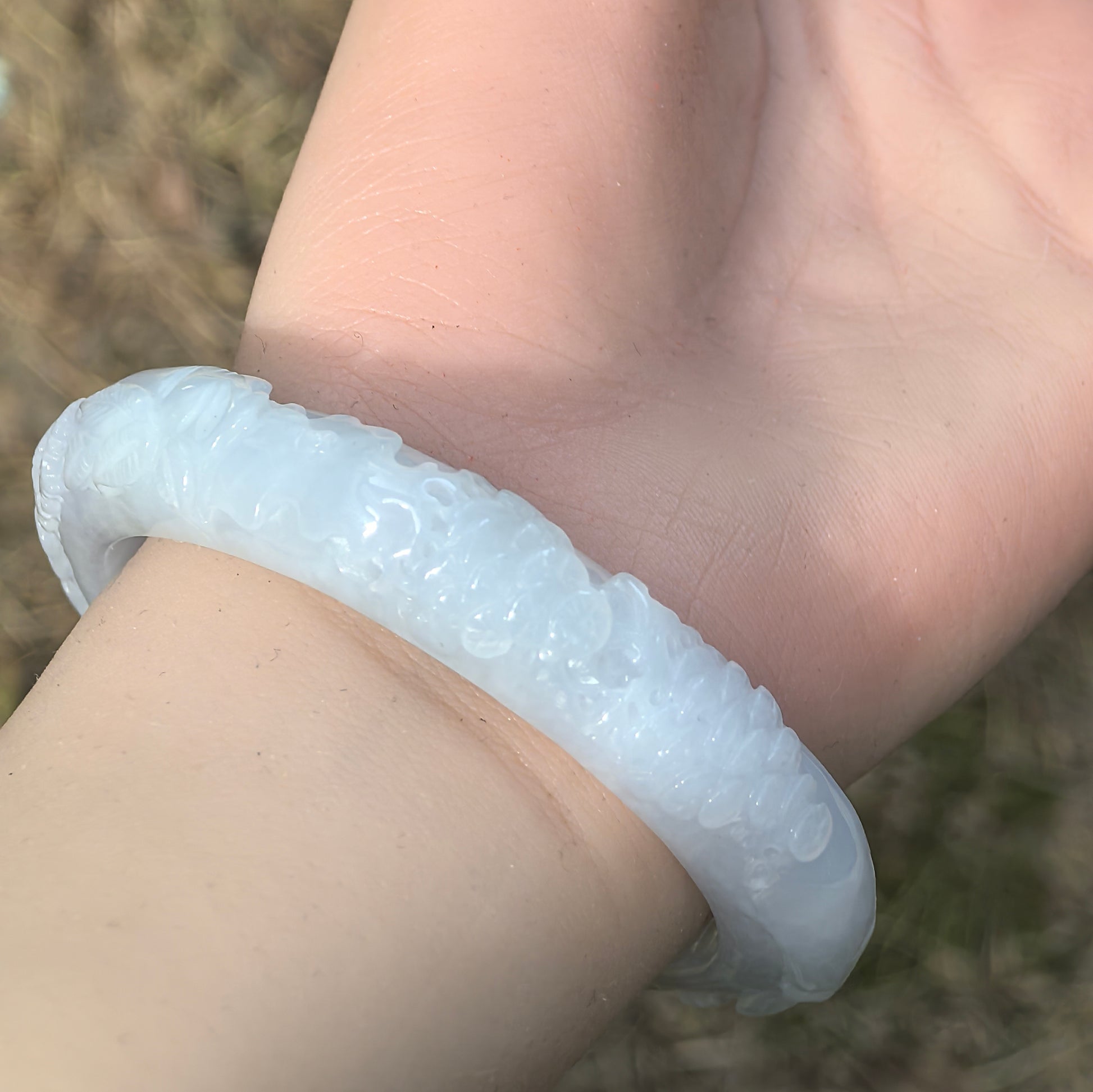 The D-shape profile sits neatly against the wrist with a reassuring weight but not too heavy. The polish is bright and the bangle is free from visible cracks or chips, making it suitable both as a statement piece for special occasions and as a collector’s item for those who enjoy detailed jade carving.