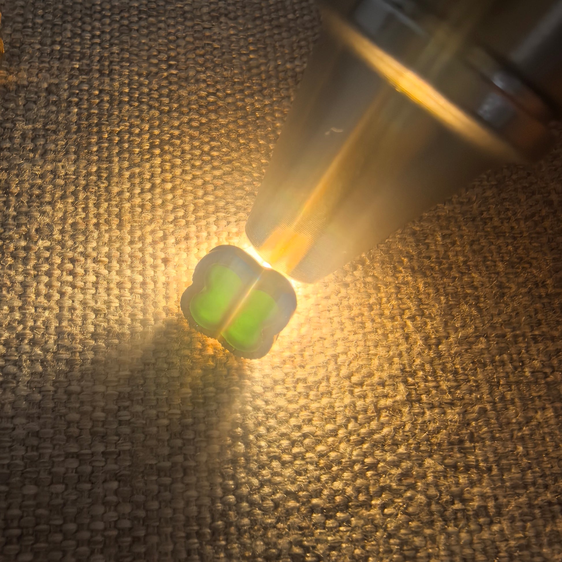 - Mostly opaque face-up; shows rich green transmission under strong backlight