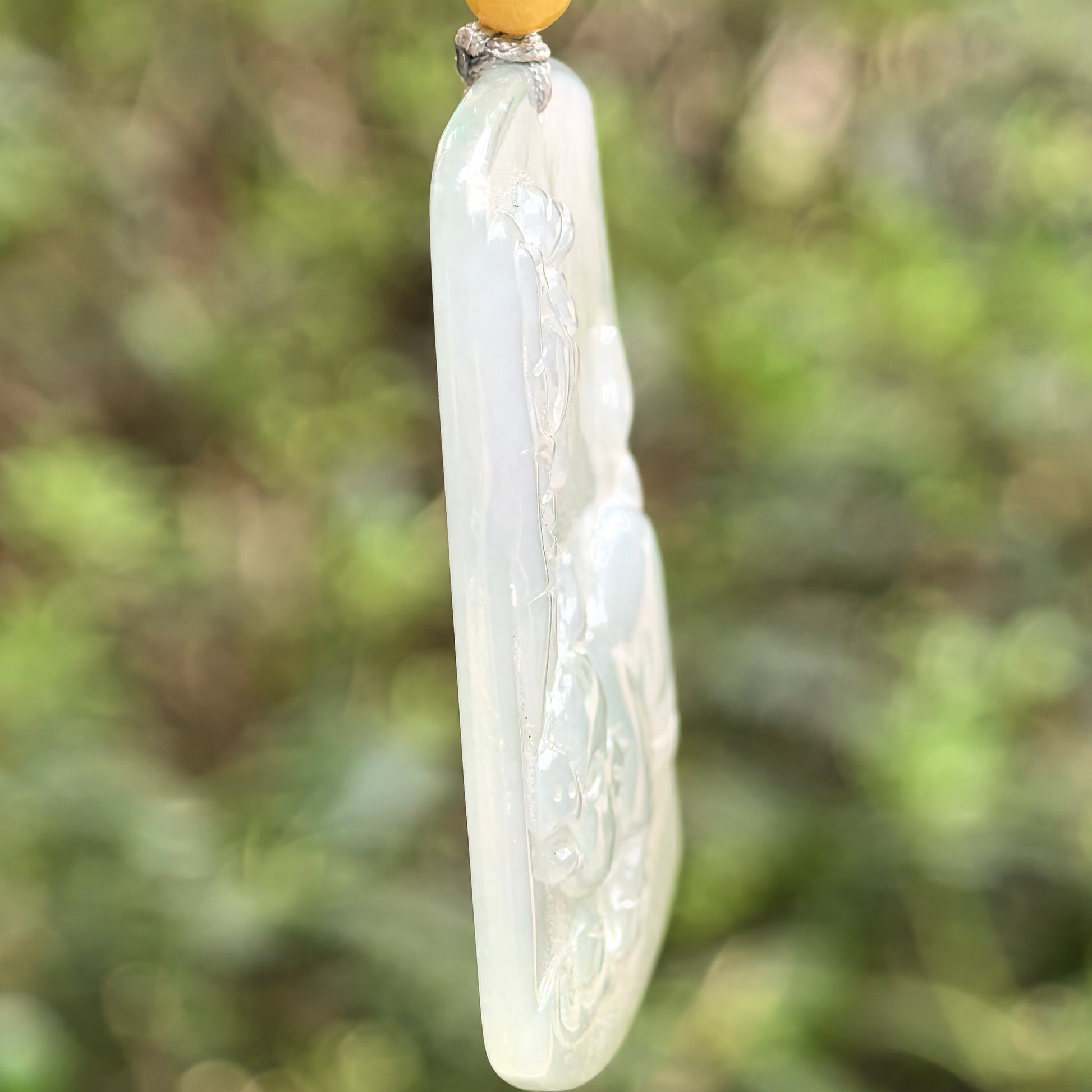 The carving is neat and wearable, with a smooth surface feel and a slightly translucent body—under certain lighting, it can faintly “show through” background text, giving it a subtle, refined depth.
