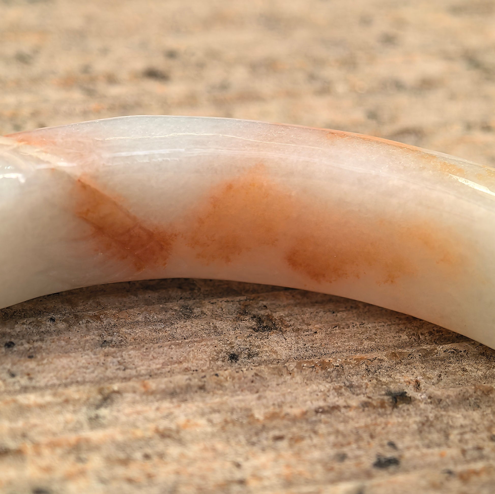 The jade texture is fine glutinous, meaning it has a compact structure and a smooth, waxy lustre rather than a sharp glassy shine. In daylight, the white reads fresh and luminous, while the golden areas show subtle depth and warmth.