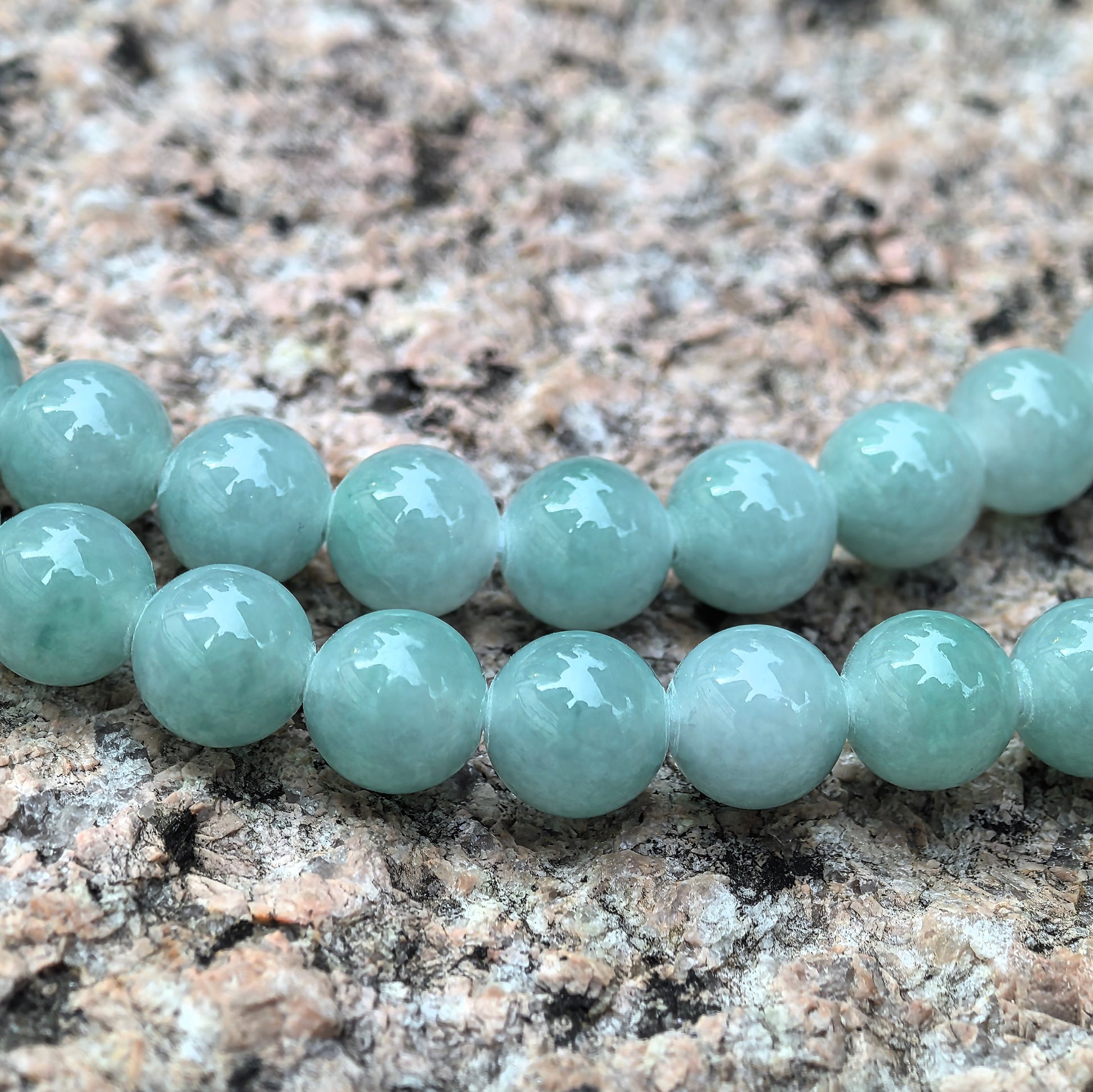 This elegant bead strand is crafted from natural Grade-A Burmese jadeite in a soft, light green tone with glutinous-icy translucency and a gentle, watery glow. The overall look is clean and refined, with a fresh, calming color that’s easy to pair with everyday outfits.