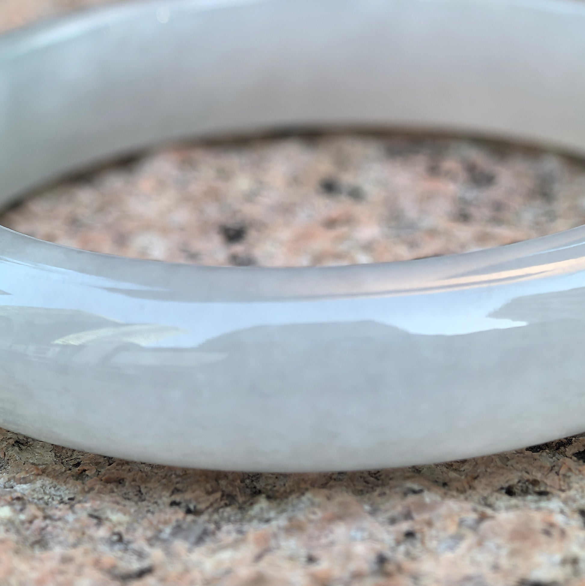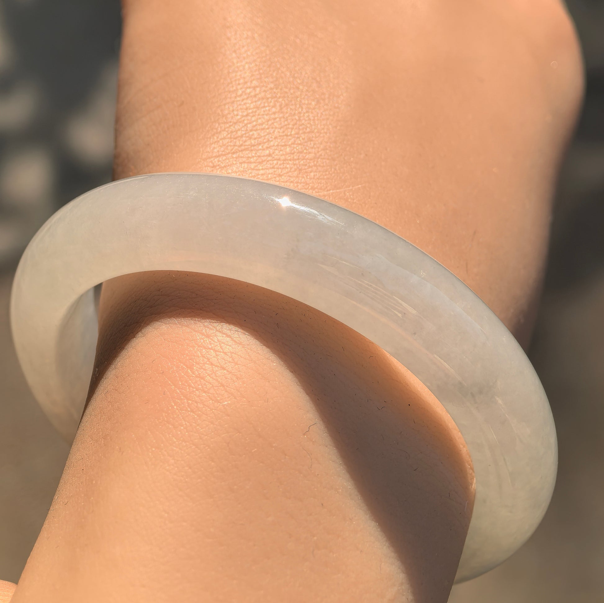This classic D-shape bangle features a clean white tone with a soft icy glow, giving it a calm, refined look that works effortlessly for everyday wear. The color reads fresh and bright in daylight, with a gentle translucency that adds depth without looking overly “glassy.”
