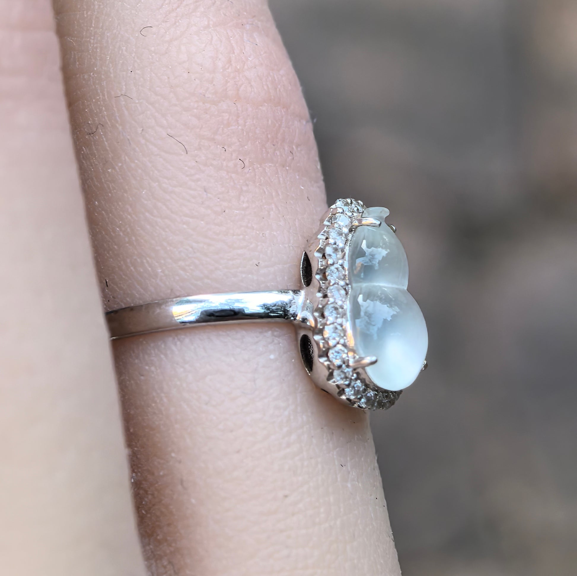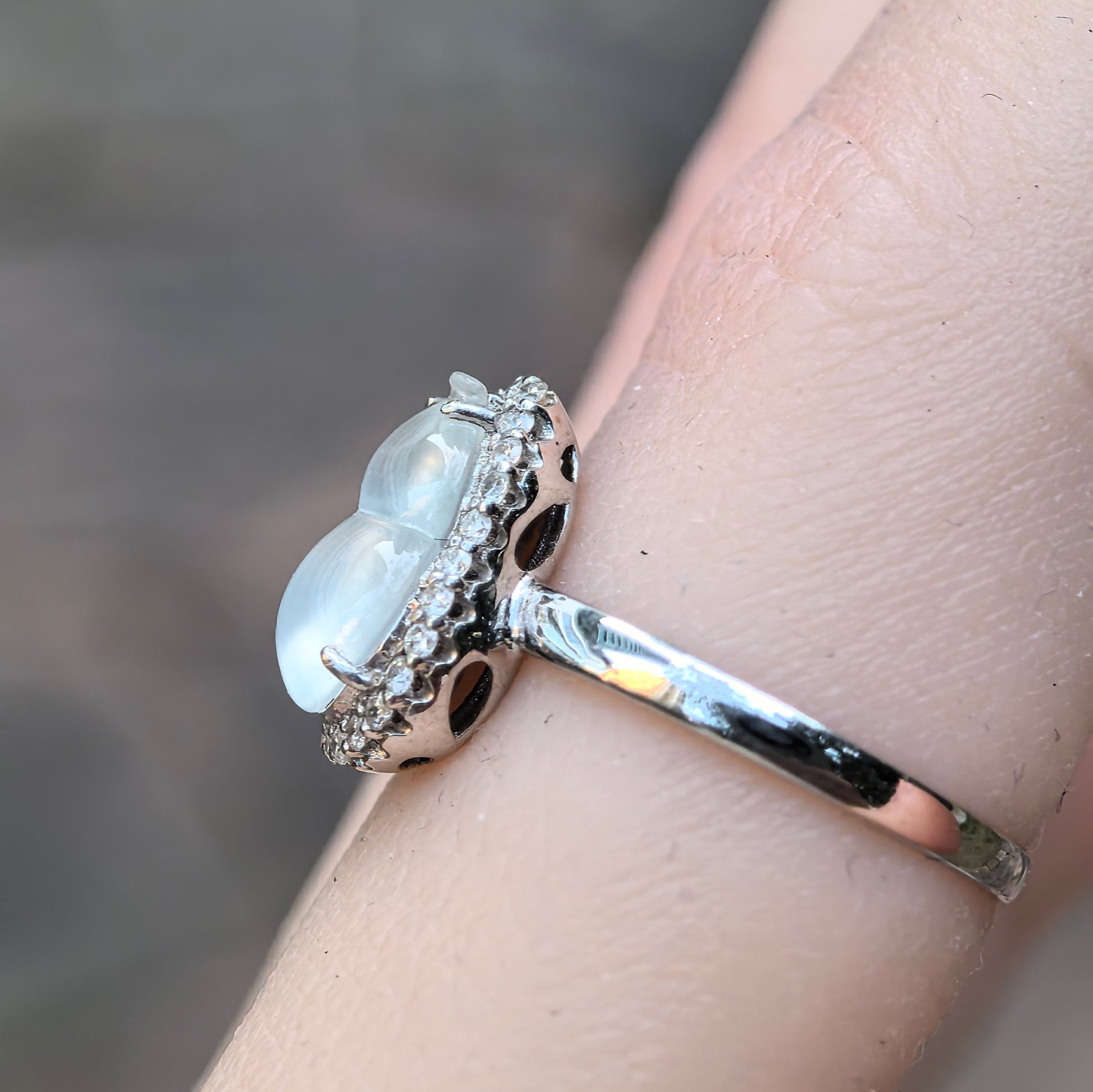 This natural Grade-A Burmese jadeite ring features a high-ice double-gourd cabochon set in solid 18K white gold. The plump, dome-like profile rises elegantly above the finger, giving the piece a luxurious “pigeon-egg” presence while still feeling refined and wearable.