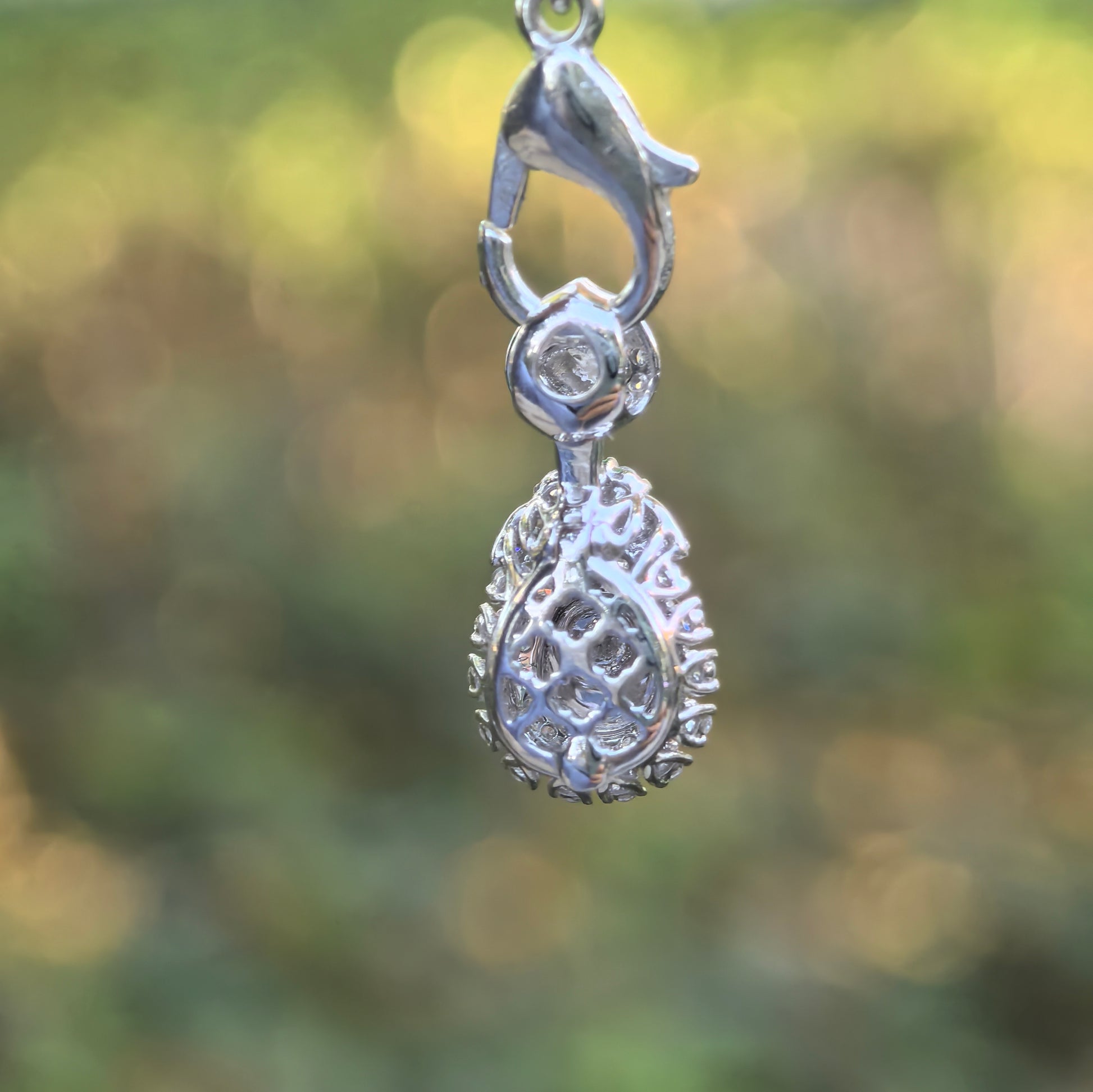 Set in solid 18K gold and framed with a diamond halo, the design has a refined two-tier drop silhouette that looks elegant on the neckline and photographs beautifully. The overall finish is neat and high-jewelry in feel, with a secure, well-balanced structure.