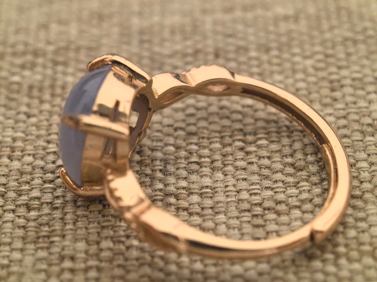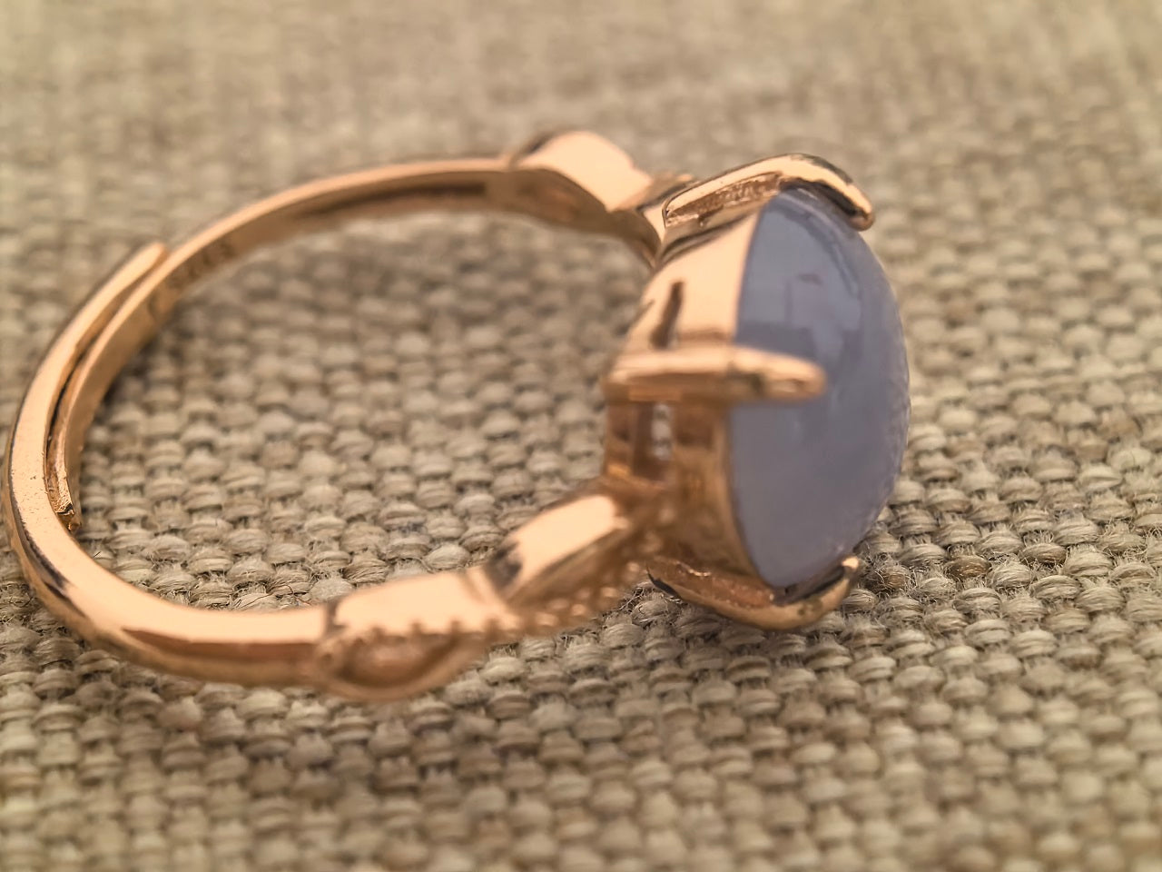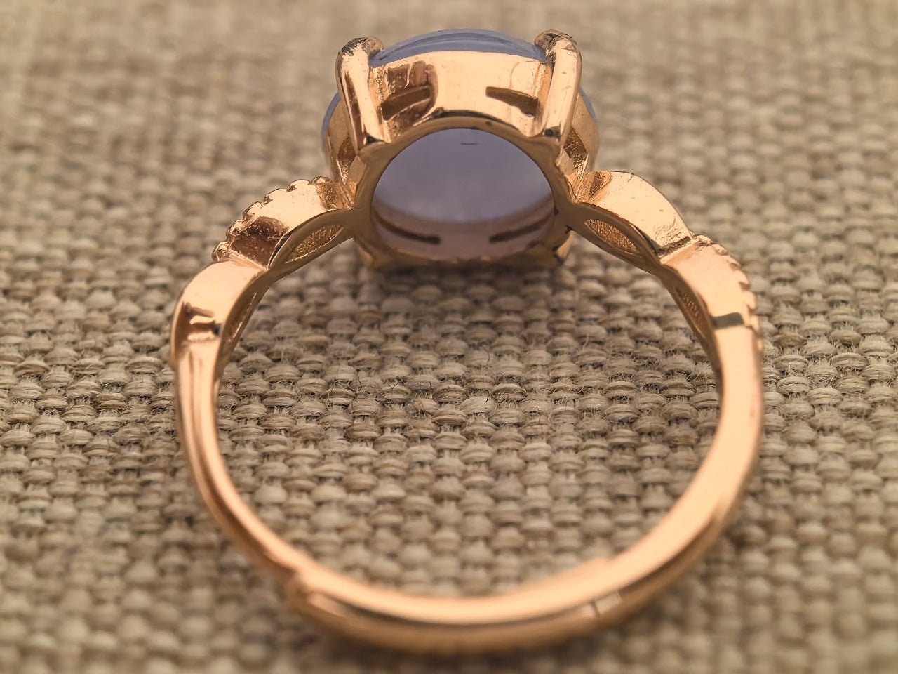 Under daylight the stone shifts between cool lavender and misty blue, giving the ring a calm, feminine character that is easy to pair with both warm and cool metal tones. The slim, double-band design keeps the focus on the jadeite while adding a modern, airy feel that suits everyday wear.