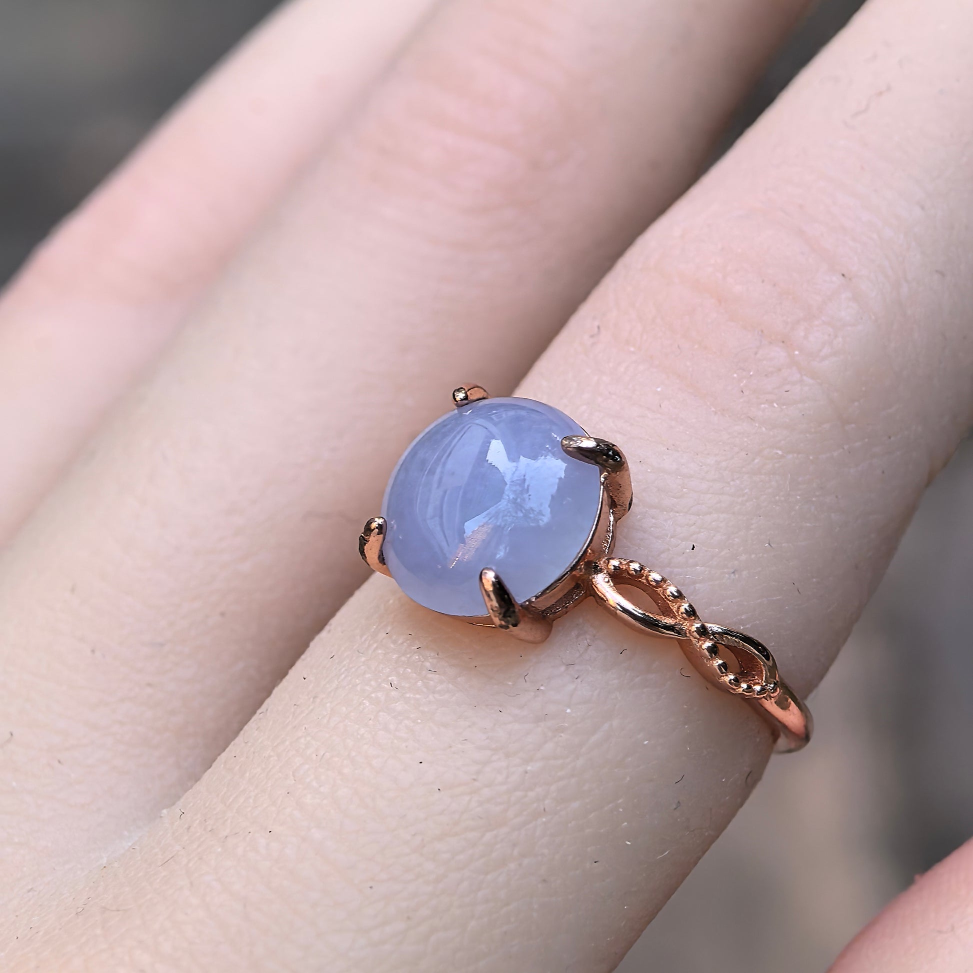 This natural Grade-A Burmese lavender jadeite ring features a round cabochon centre stone in a soft lilac-blue tone, set in a delicate 925 silver band with an elegant twisted detail. The jadeite shows a gentle, icy glow that keeps the lavender colour looking clean and refined on the hand.