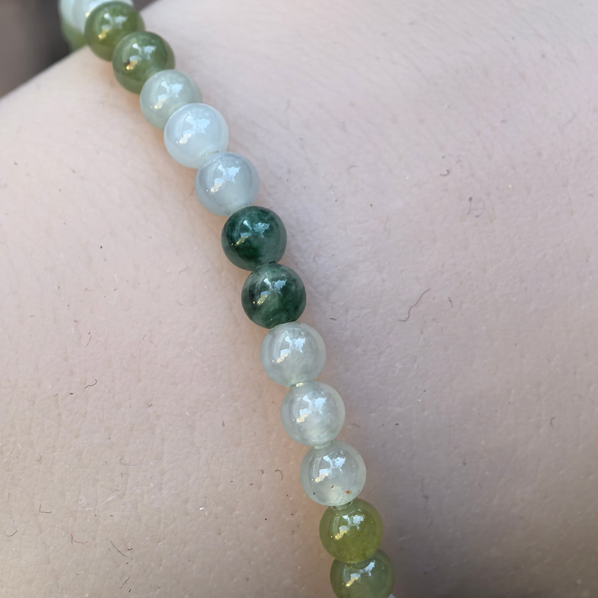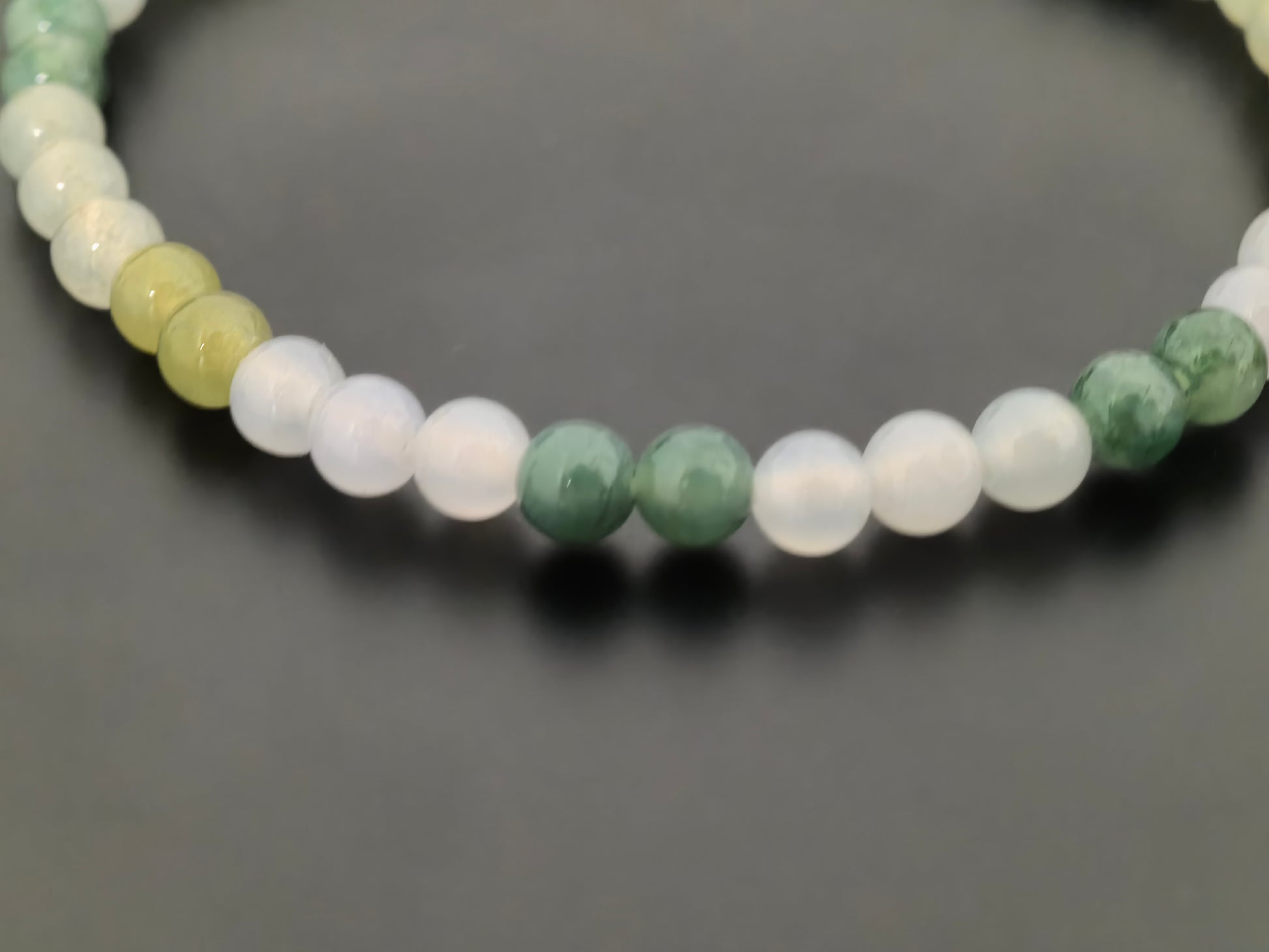 - Mix of dark and medium greens, pale yellow and soft white jadeite beads