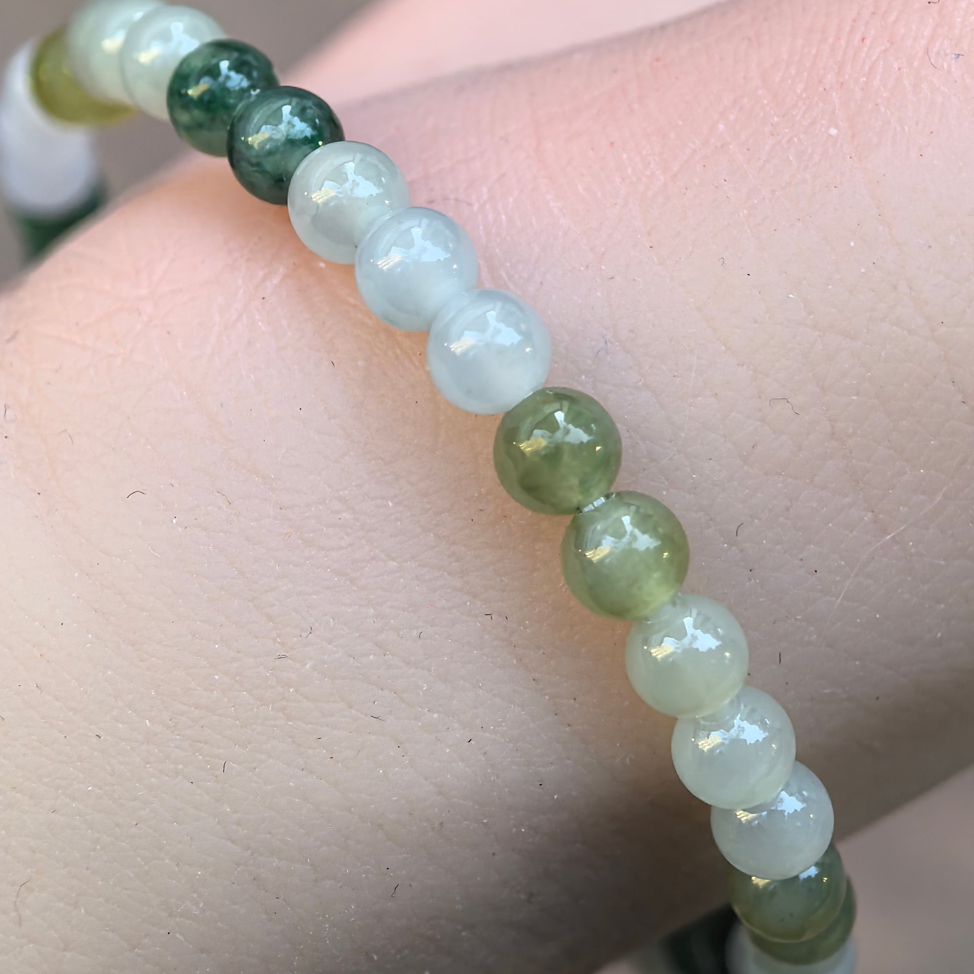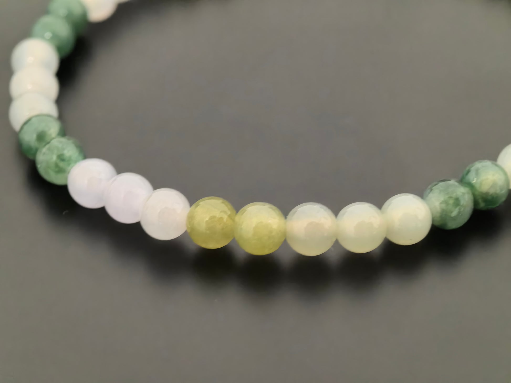 This slim multicolor jadeite bracelet is strung with 4.6 mm round beads in soft icy greens, mossy greens, pale yellow and clean white. The colors are arranged in a gentle gradient, so you get darker greens on one side and lighter tones on the other, giving the wrist a fresh but understated look. The glutinous-to-icy texture on many beads shows a quiet inner glow under natural light.