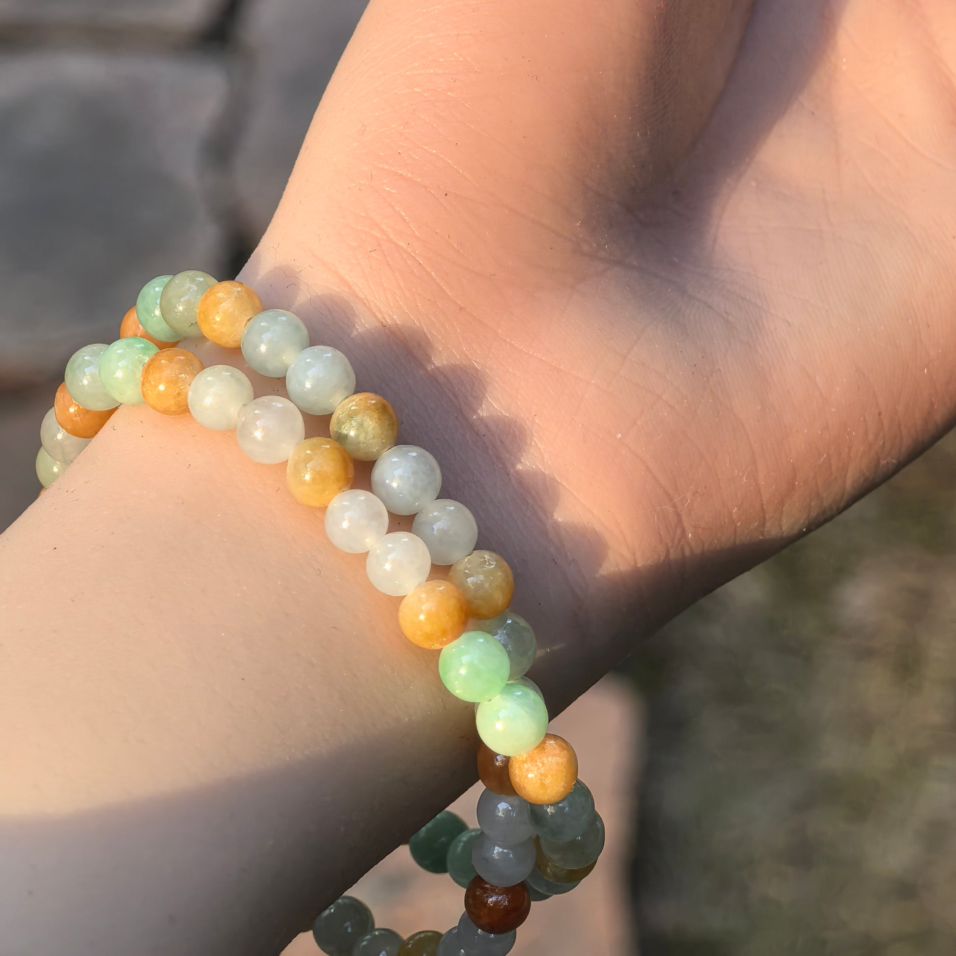 Natural Grade-A Jadeite Bracelet – Multicolor Glutinous Burmese Jade Beads Double Wrap 6mm
