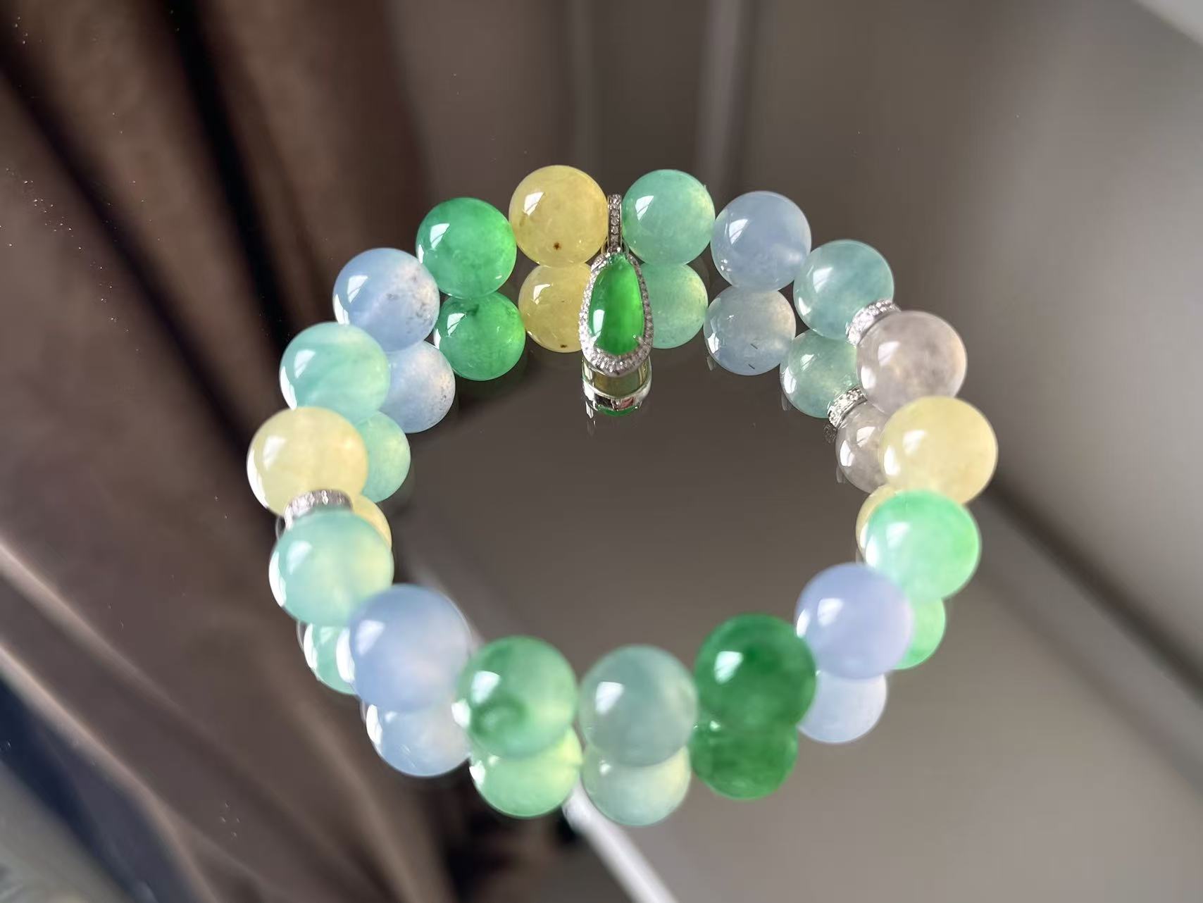 This luxurious bracelet features an elegant mix of Natural Grade-A Burmese Jadeite beads in icy green, soft yellow, sky blue, and misty gray tones — each bead hand-polished to reveal its natural translucency and smooth texture.