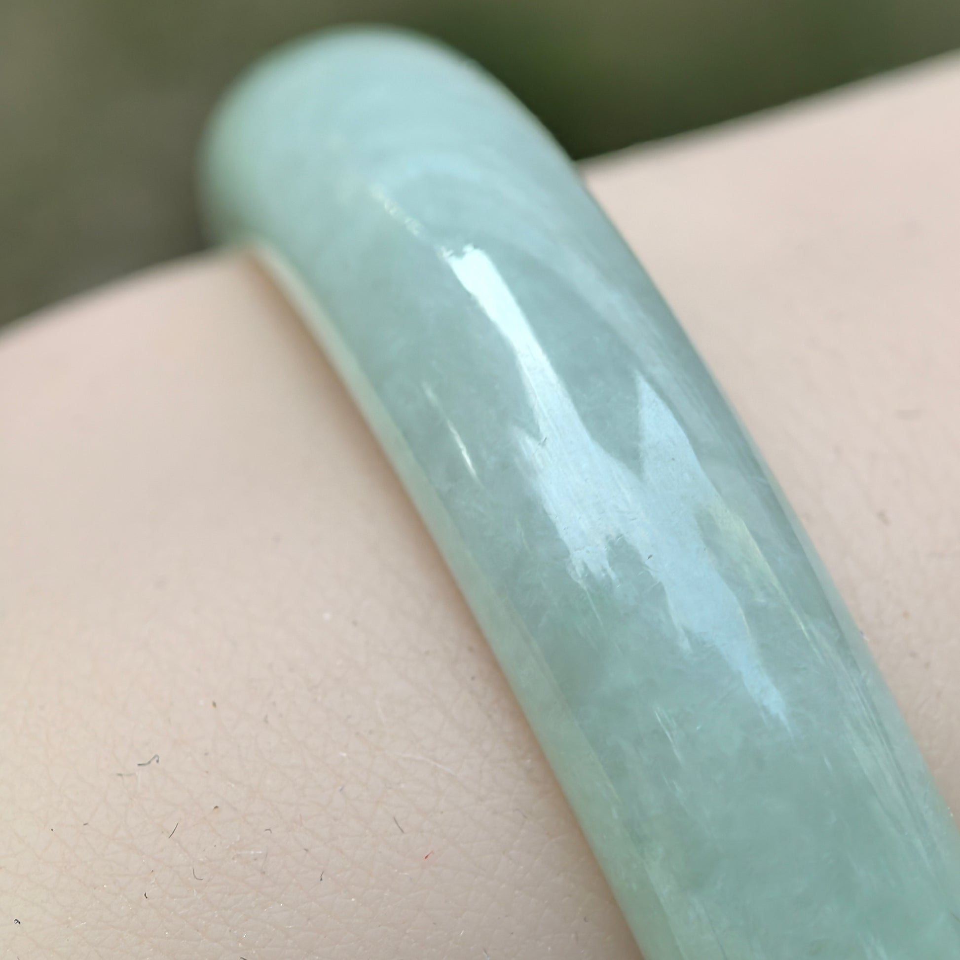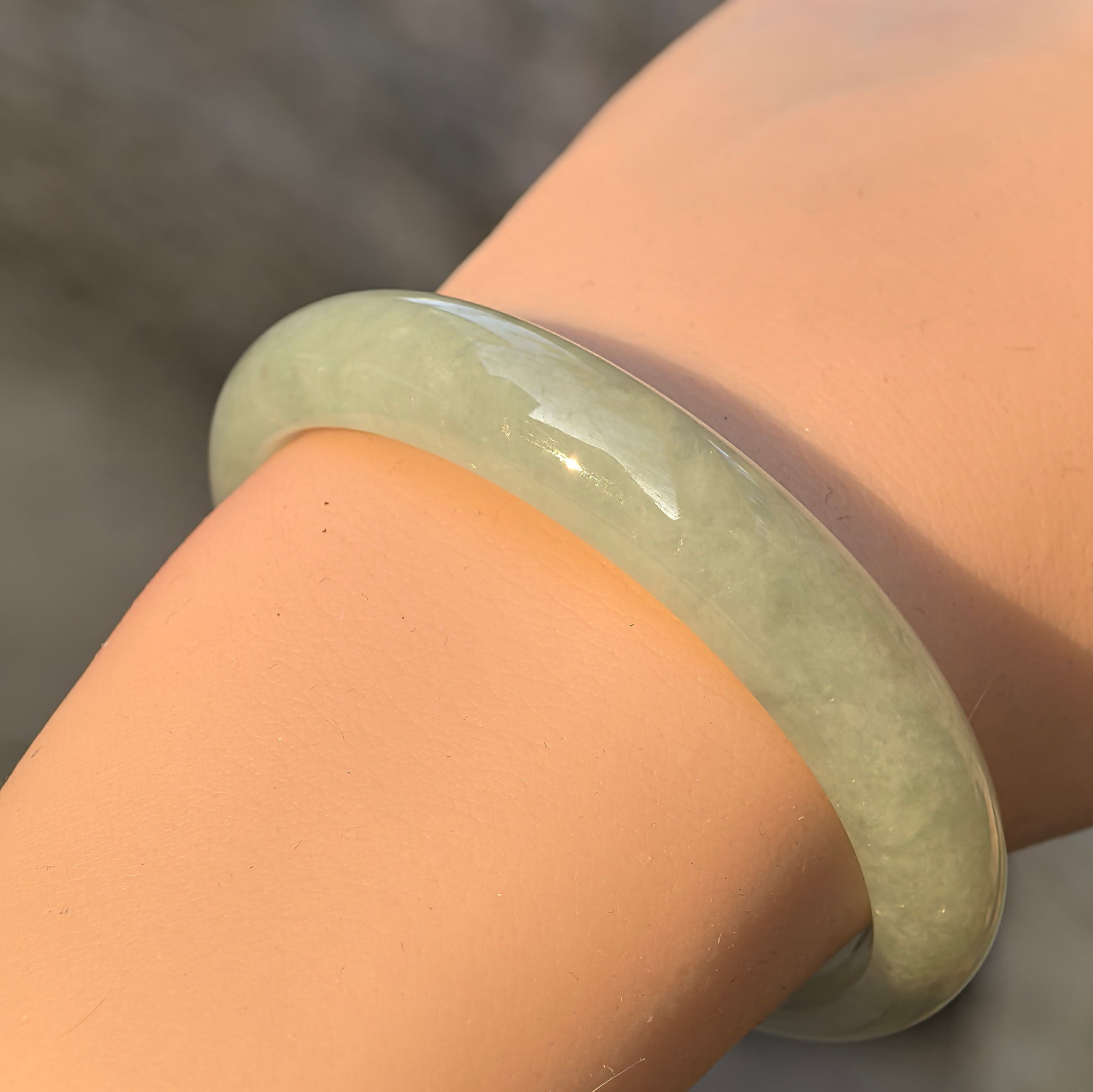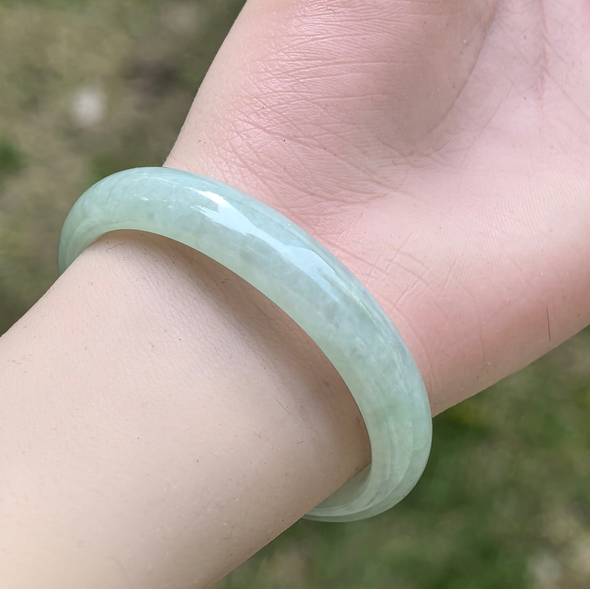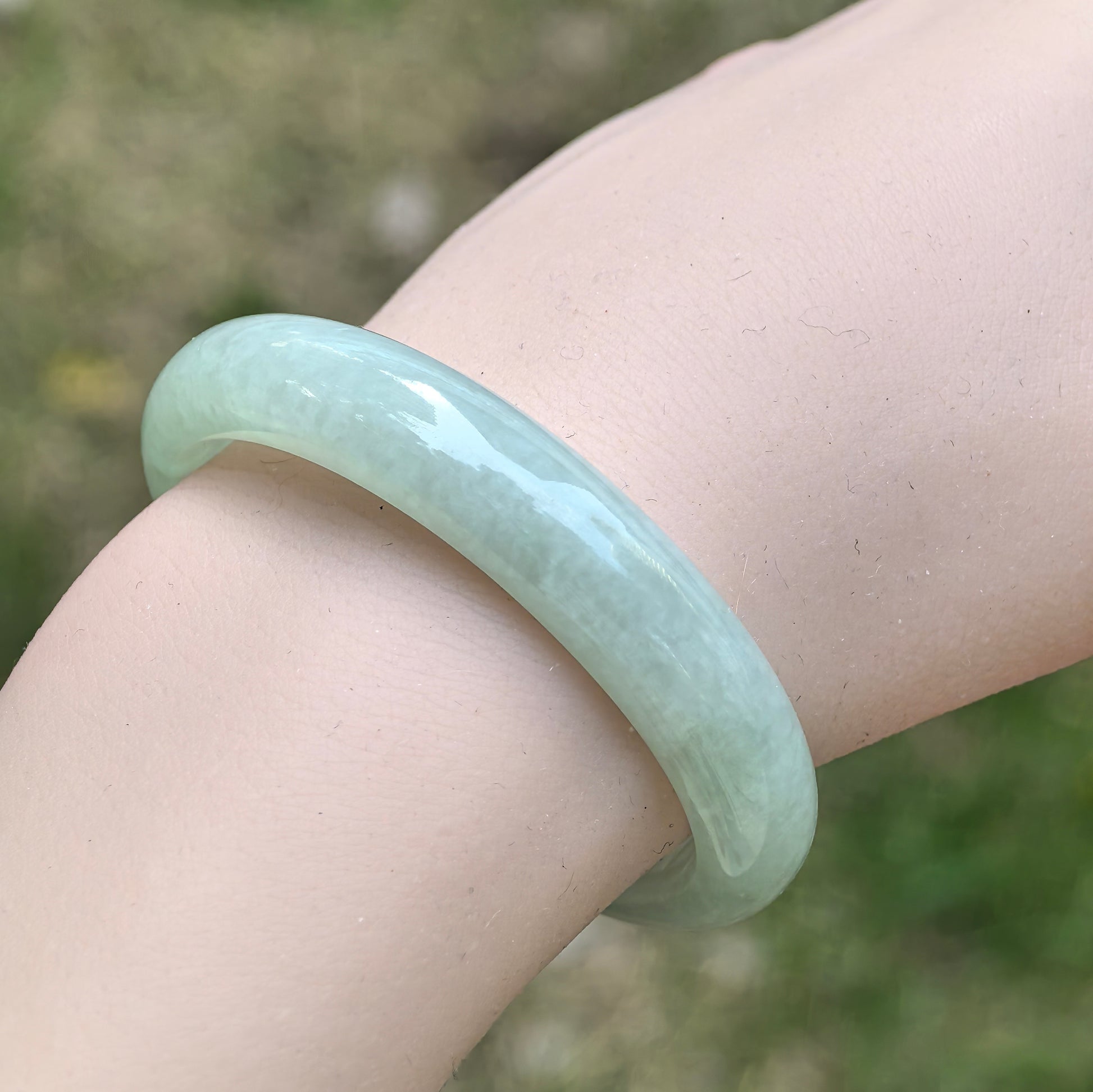 This natural Burmese jadeite oval bangle has a soft, even pale green tone with a gentle watery glow. The texture is glutinous, with fine to medium grain and a calm, understated translucency that feels soothing on the wrist.