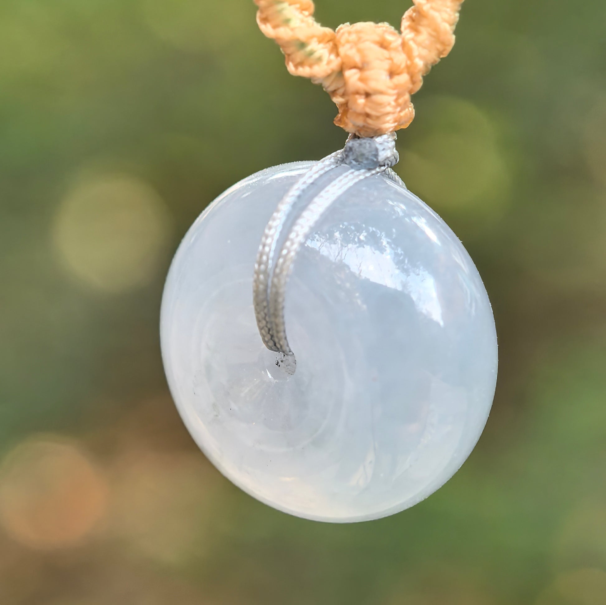 This peace pendant features an icy-gel jadeite body with a very subtle light lavender base tone. The purple tint is intentionally understated rather than “flashy,” giving the piece a calm, clean look that pairs easily with everyday outfits.