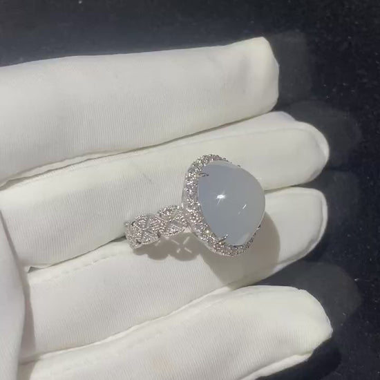 This platinum “pigeon-egg” jadeite ring features a high, rounded icy cabochon with a gentle blue-white tone. The dome rises clearly above the halo, giving the stone presence on the hand while keeping the overall look soft and luminous rather than harsh or overly bright.