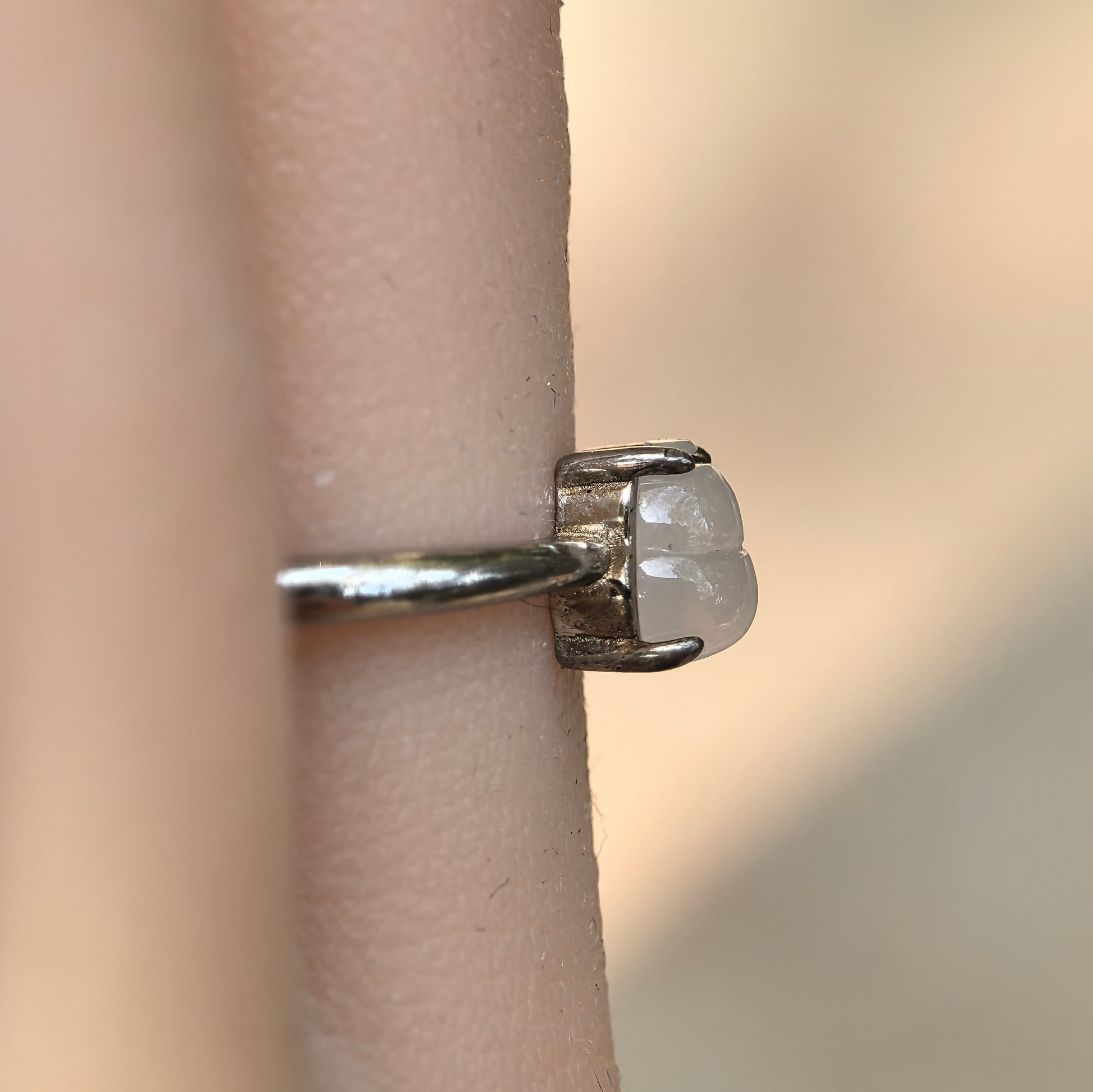 This ring features a glutinous icy white Hulu (gourd) jadeite carving set in bright silver. The jade shows a soft, misty translucency with a gentle internal glow, giving a subtle and elegant presence on the hand rather than a high-contrast, opaque colour block.