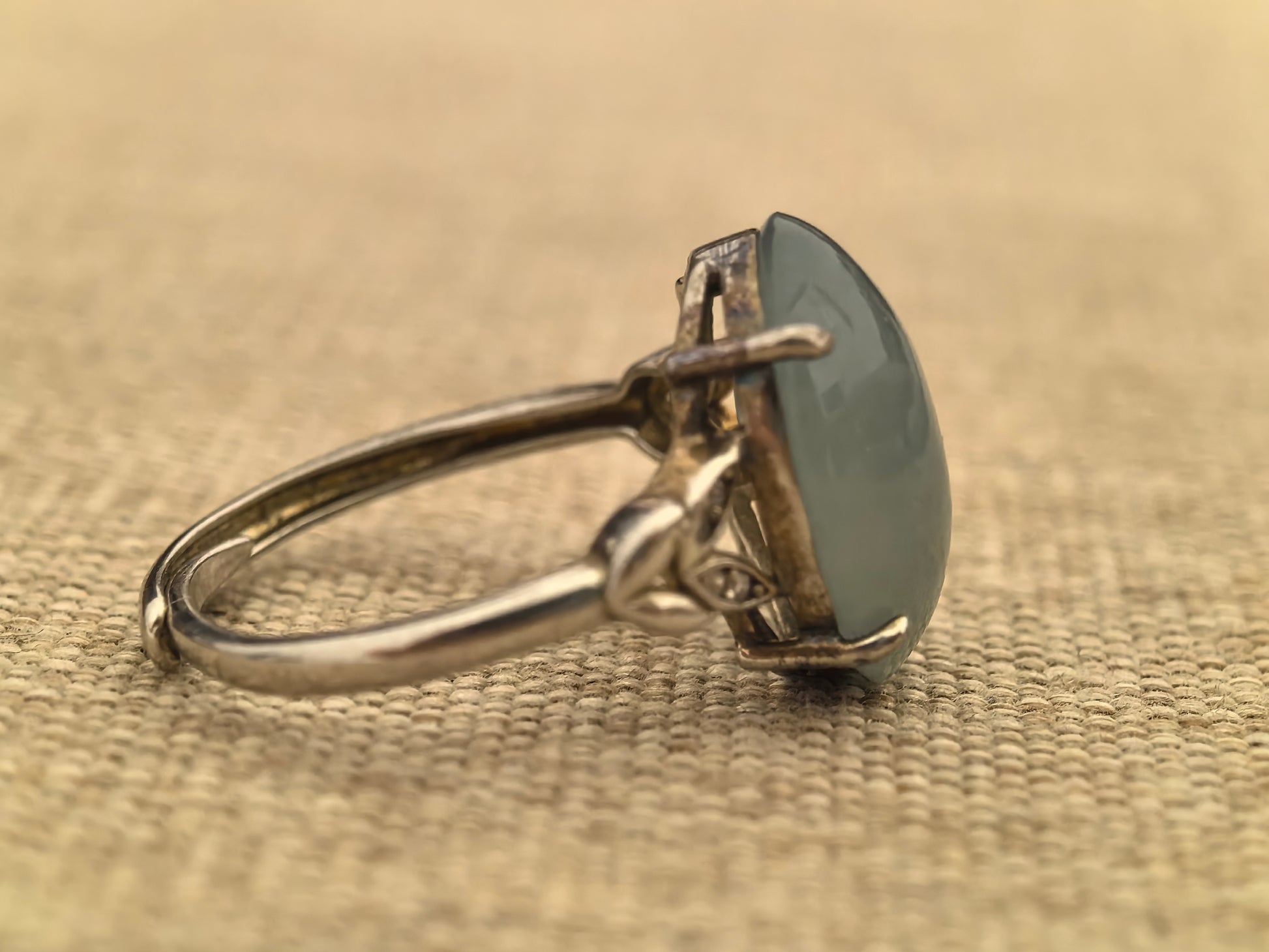 The oval jade is held by classic claws on a slim silver band with small decorative details on the shoulders, so it has presence without feeling bulky. The band is an adjustable style designed around an inner diameter of about 19 mm and can be opened slightly larger, which makes it more forgiving for different finger sizes or for gifting.
