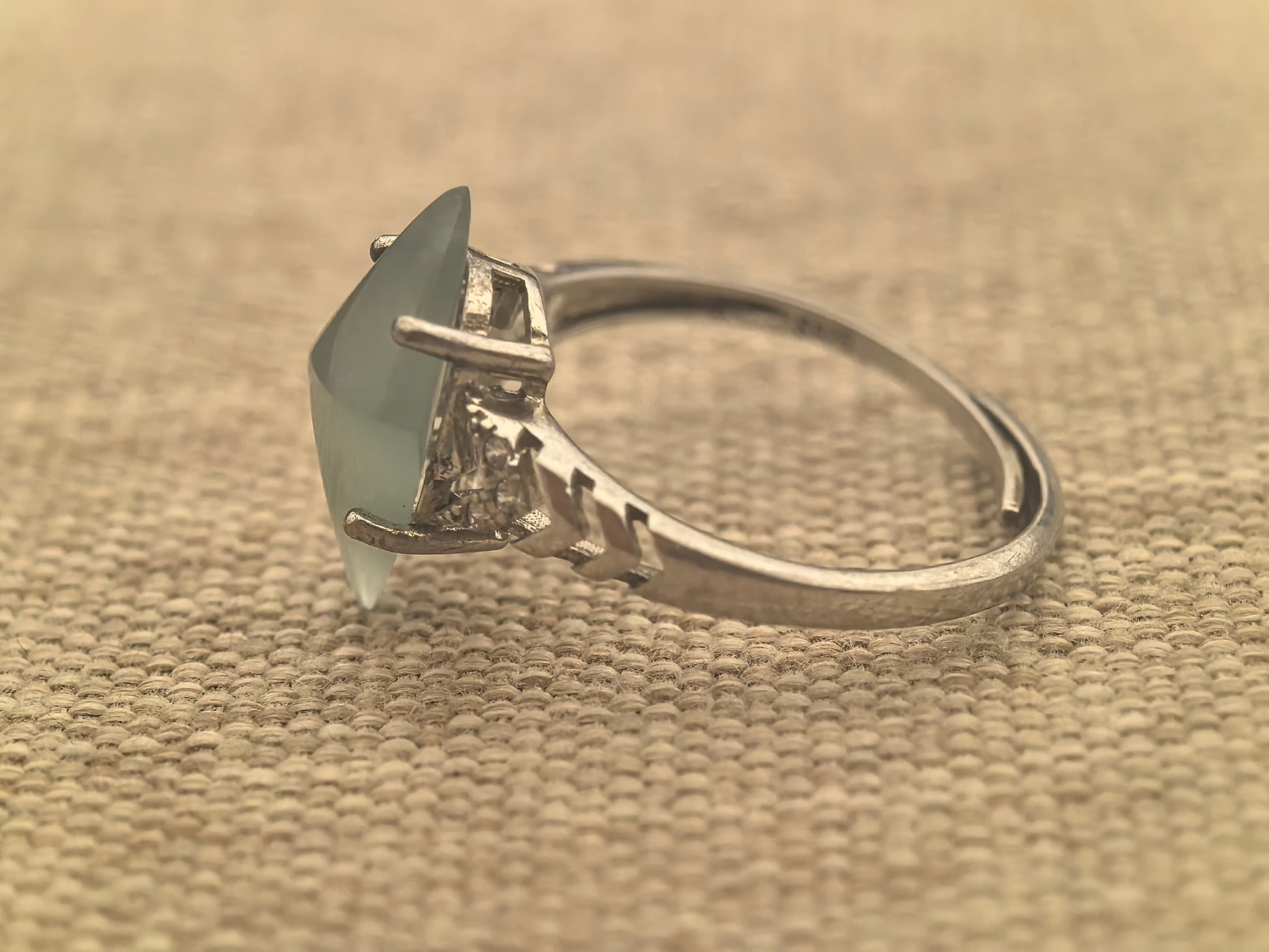 This ring features an icy lake green jadeite stone cut into a slim diamond shape and set in a silver frame, giving a fresh, distinctive look on the hand. The icy translucent texture makes the stone look clear and bright, with a crisp glow when it catches the light.