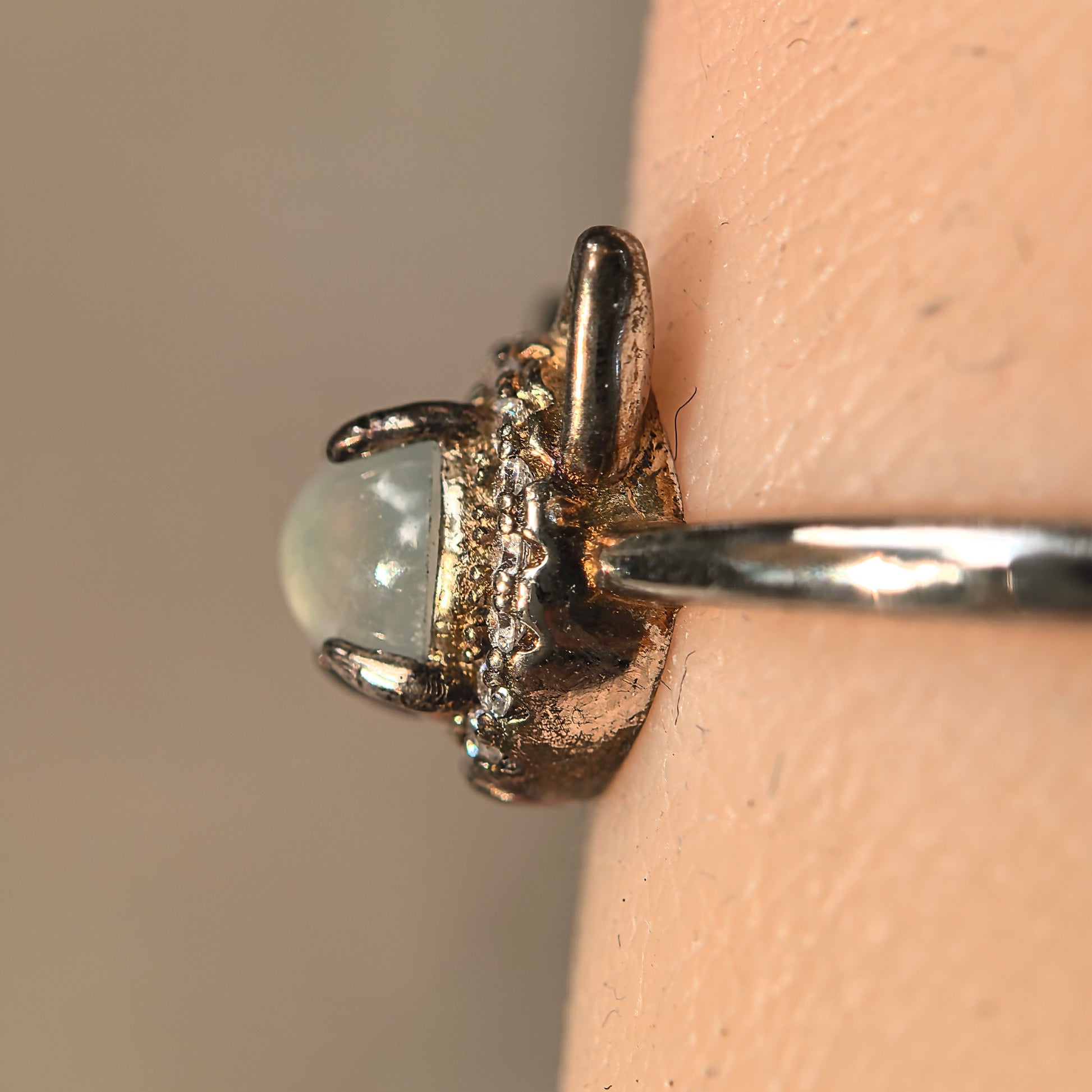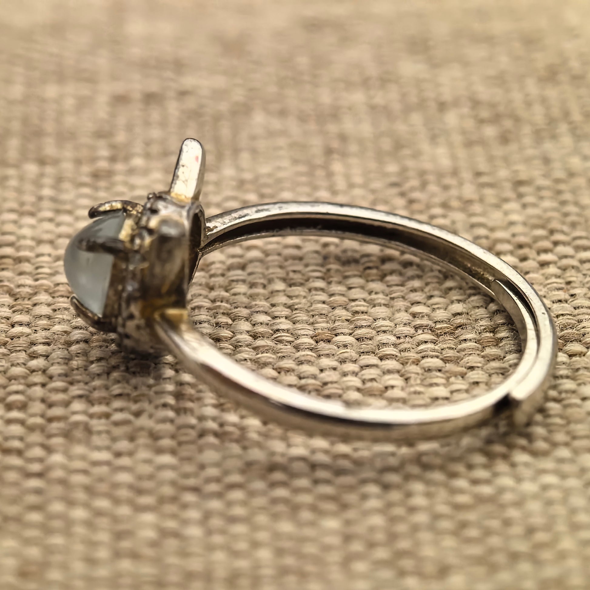 The jade is secured with sturdy prongs on a slim silver band, with sparkling pavé detailing that adds brightness without feeling too heavy. The band is an adjustable style designed around an inner diameter of about 17 mm and can be opened slightly larger, making sizing more forgiving and easier for gifting.