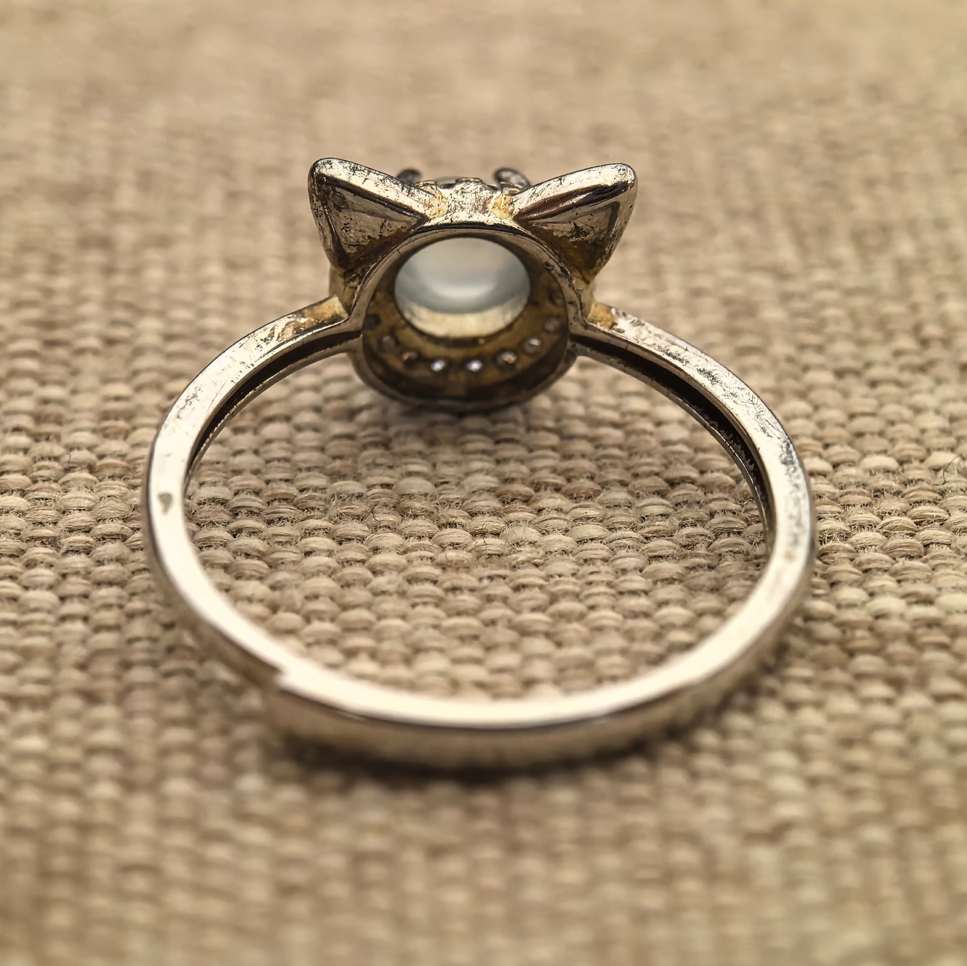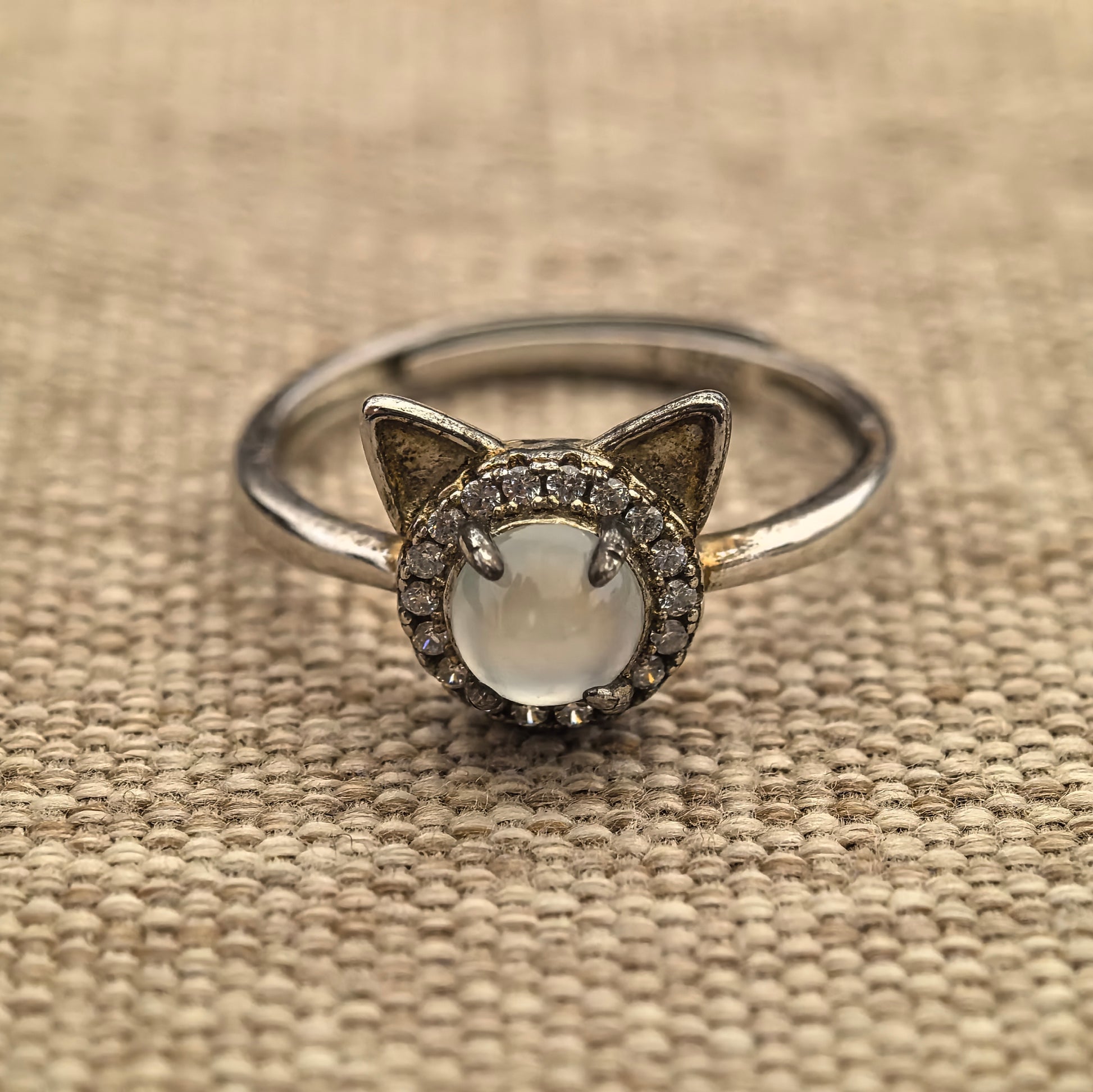 This ring features an icy white jadeite cabochon in a clean round shape, set in a bright silver cat head with small accent stones outlining the ears and face. The colour is clear and fresh, giving a gentle glow on the hand rather than a harsh or overly shiny look.