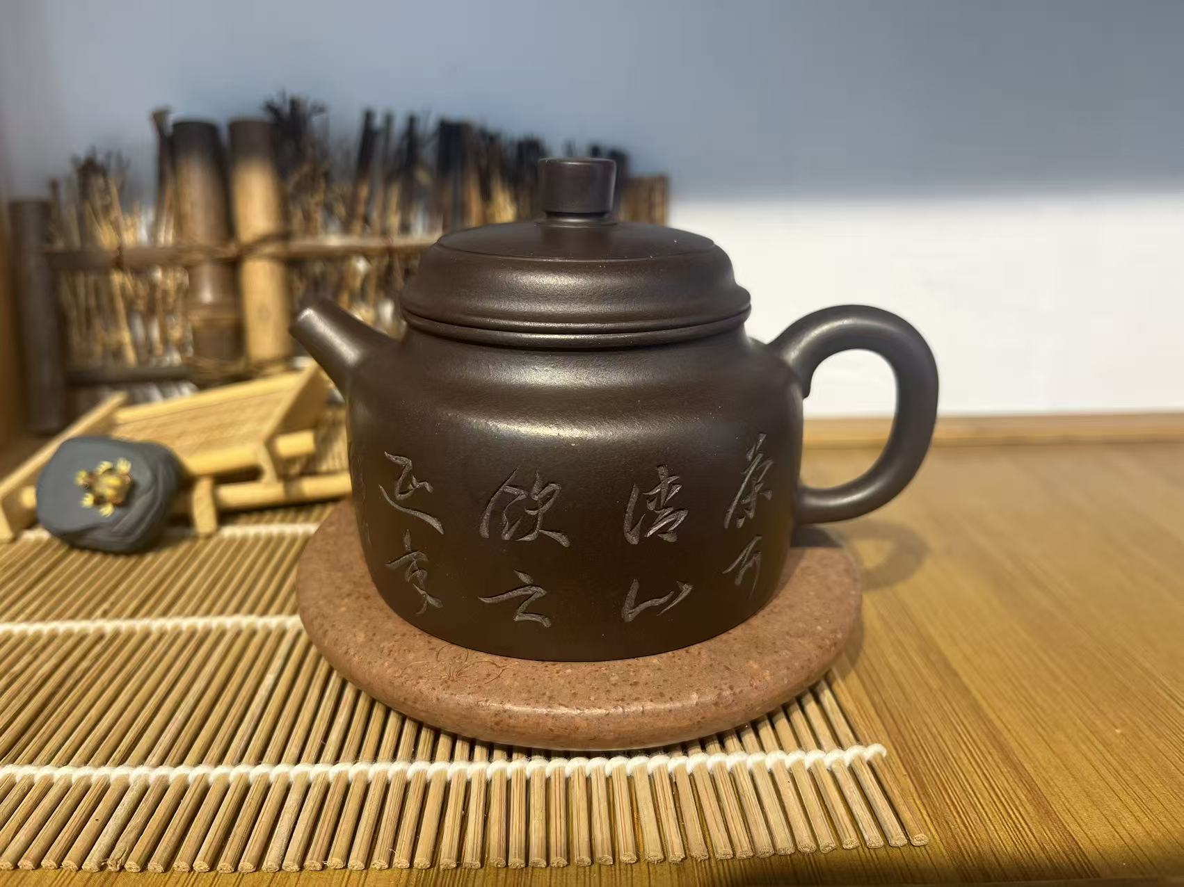A compact 200ml Yixing teapot with a calm, upright profile. The straight-wall body and hand-engraved calligraphy make it feel almost like a small meditation object on the tea table – perfect for one person’s quiet gongfu tea ritual.