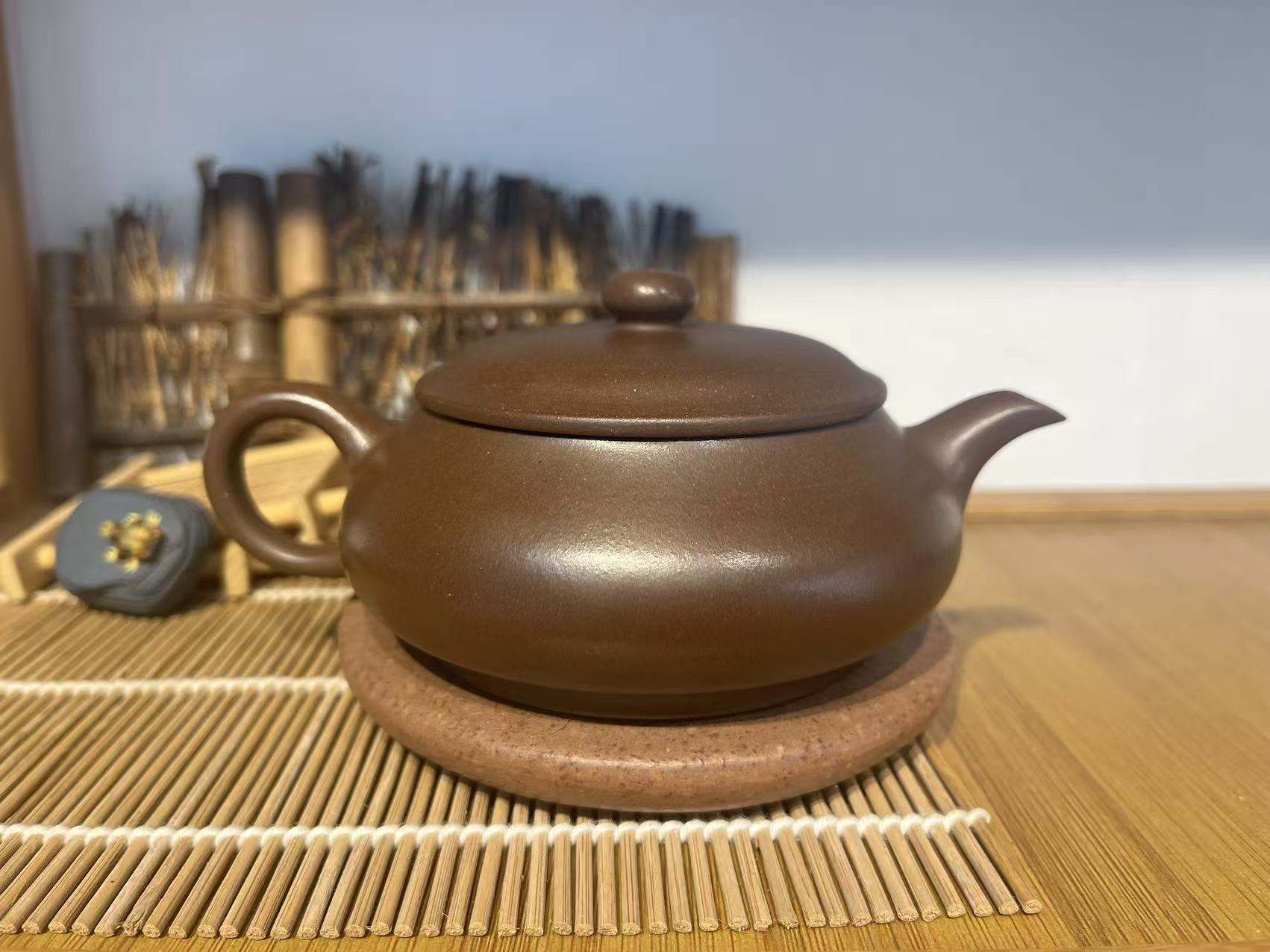 Soft, low and quietly rounded, this 220ml Yixing teapot feels like a small clay moon on the tea table. The flat-round body and unglazed purple clay make it a perfect everyday pot for one or two people.