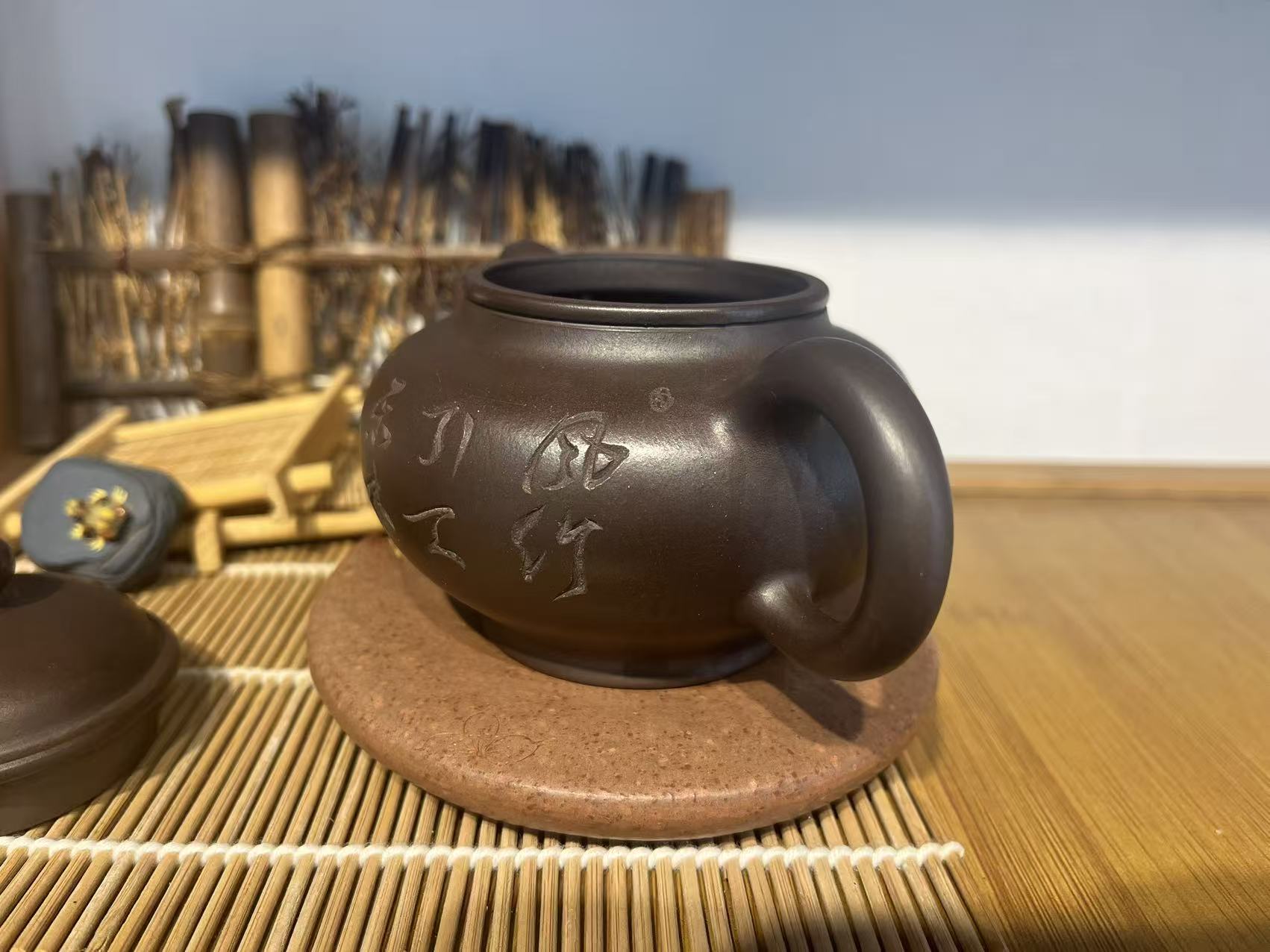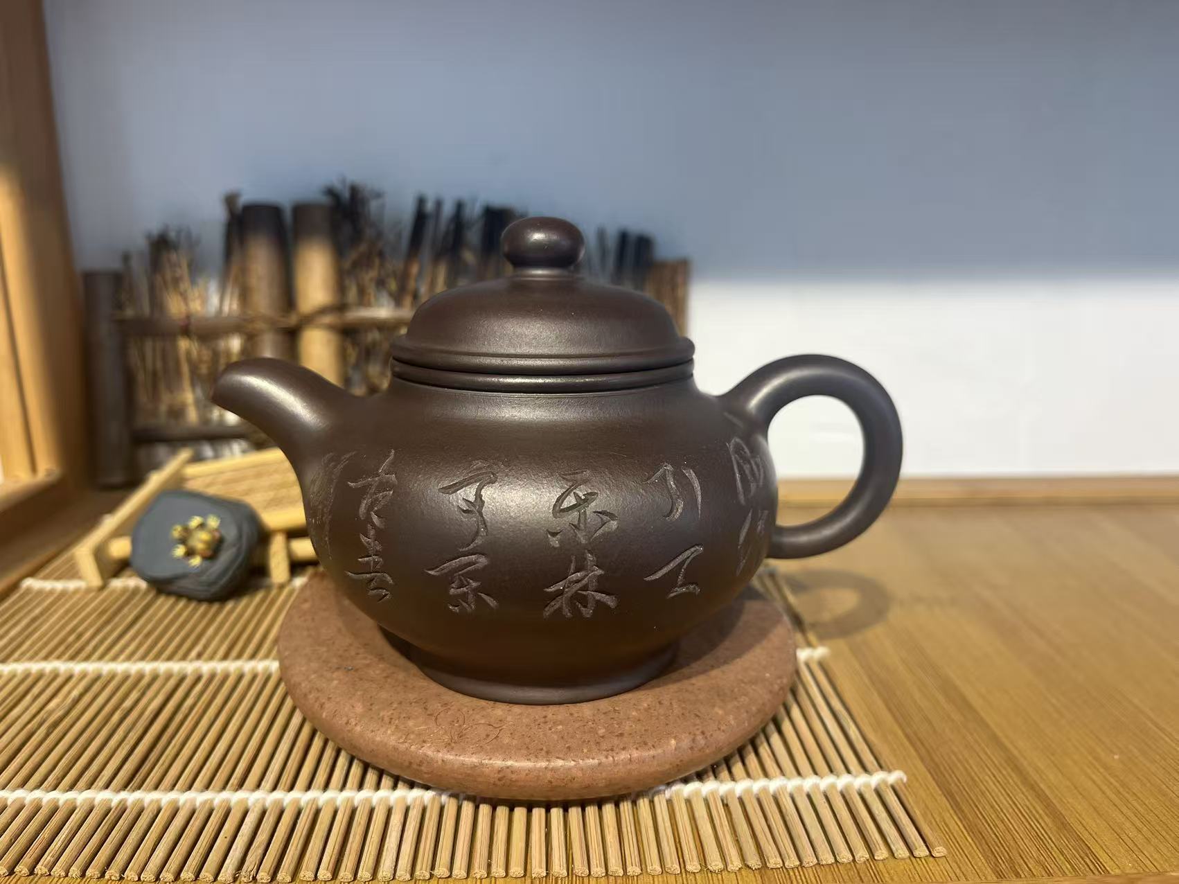 Shape: classic round-belly teapot with hand-engraved Chinese characters